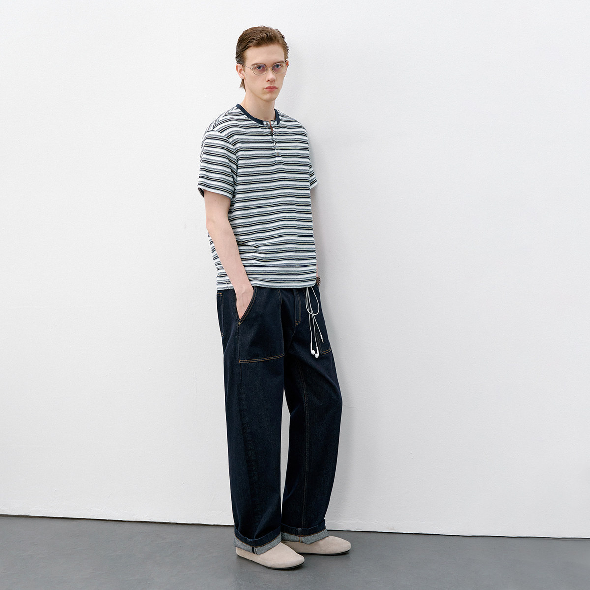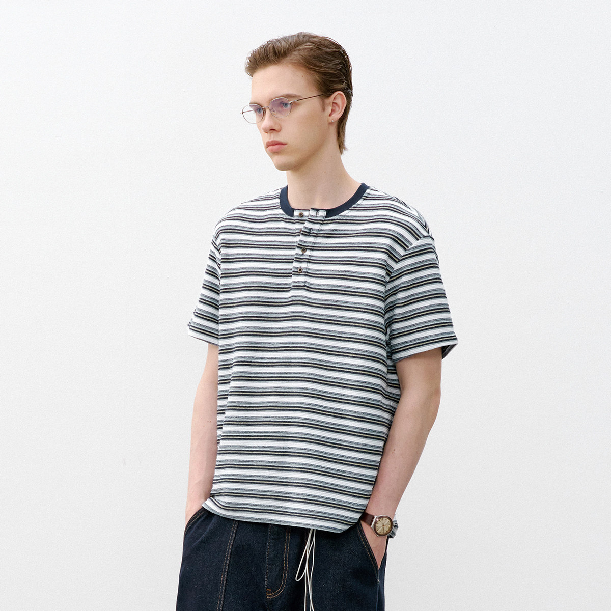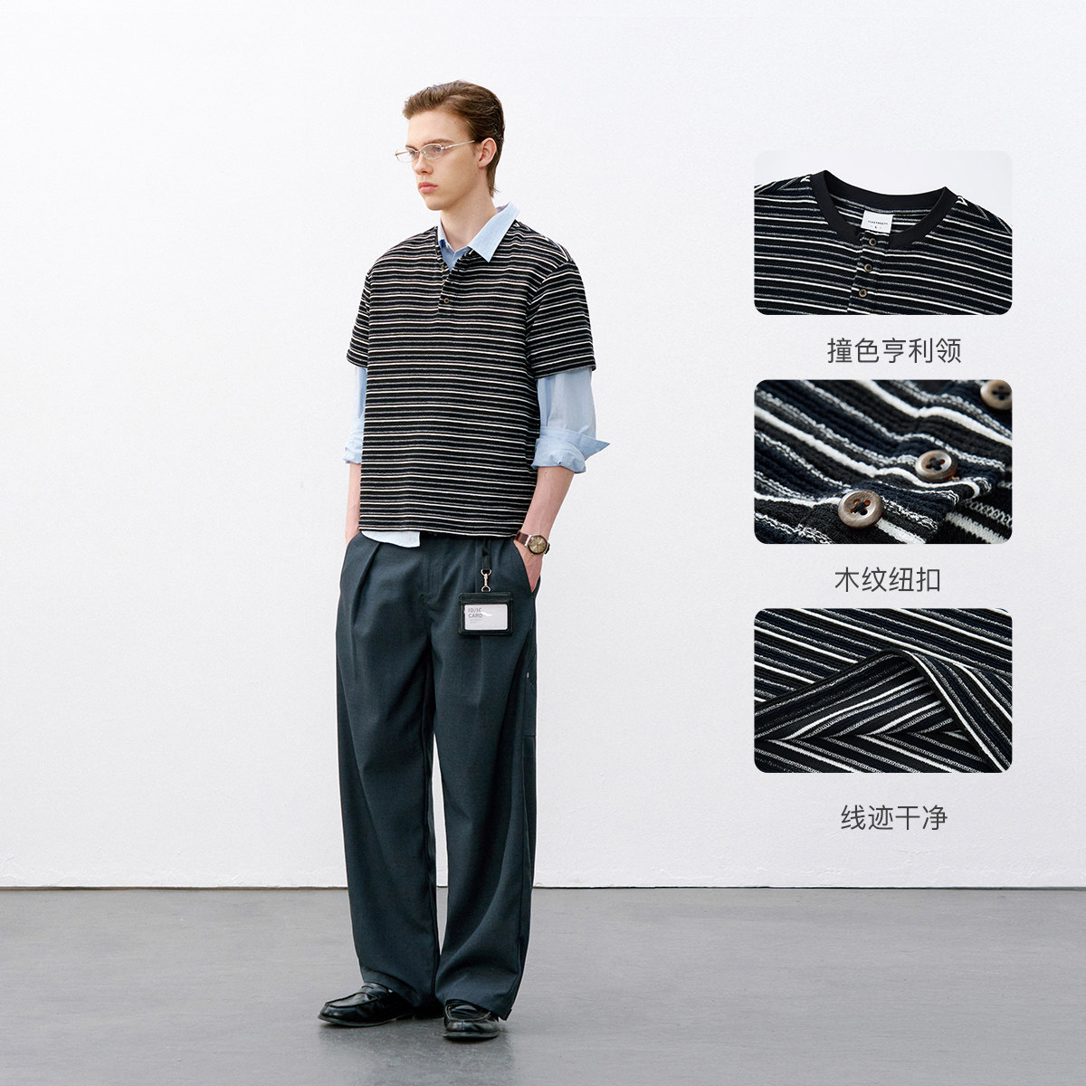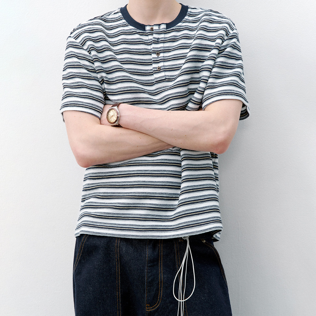 714street复古亨利领短袖T恤,2026春季潮牌力作,融合经典与潮流。采用半开领设计,搭配精致条纹元素,展现复古休闲风范。精选优质针织面料,亲肤透气,穿着舒适挺括。简约亨利领口,无过多装饰,凸显低调质感与男性儒雅气质。短袖剪裁利落,适合春日叠穿或单穿,轻松驾驭街头、通勤等多种场景。无论是搭配牛仔裤还是休闲裤,都能轻松打造随性时髦造型。714street以细节诠释品质,是追求个性与舒适并重的时尚之选,为春日衣橱注入复古潮酷新活力。