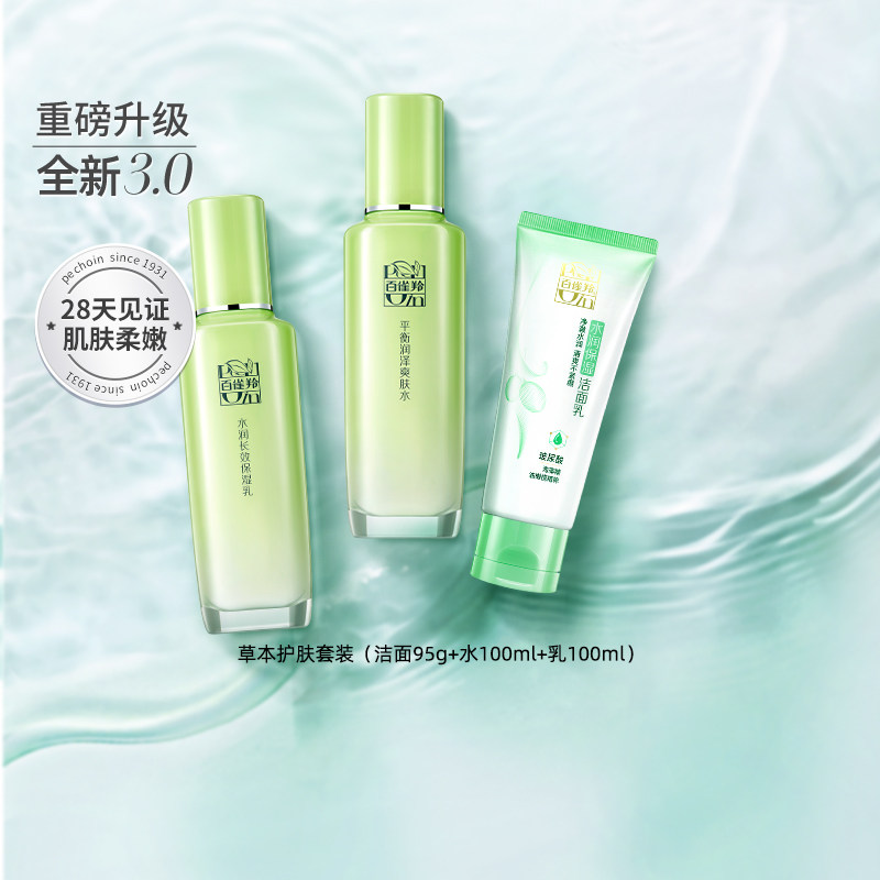 天猫百雀羚草本护肤水乳洁面套装补水保湿滋润爽肤水乳液洁面护肤全套