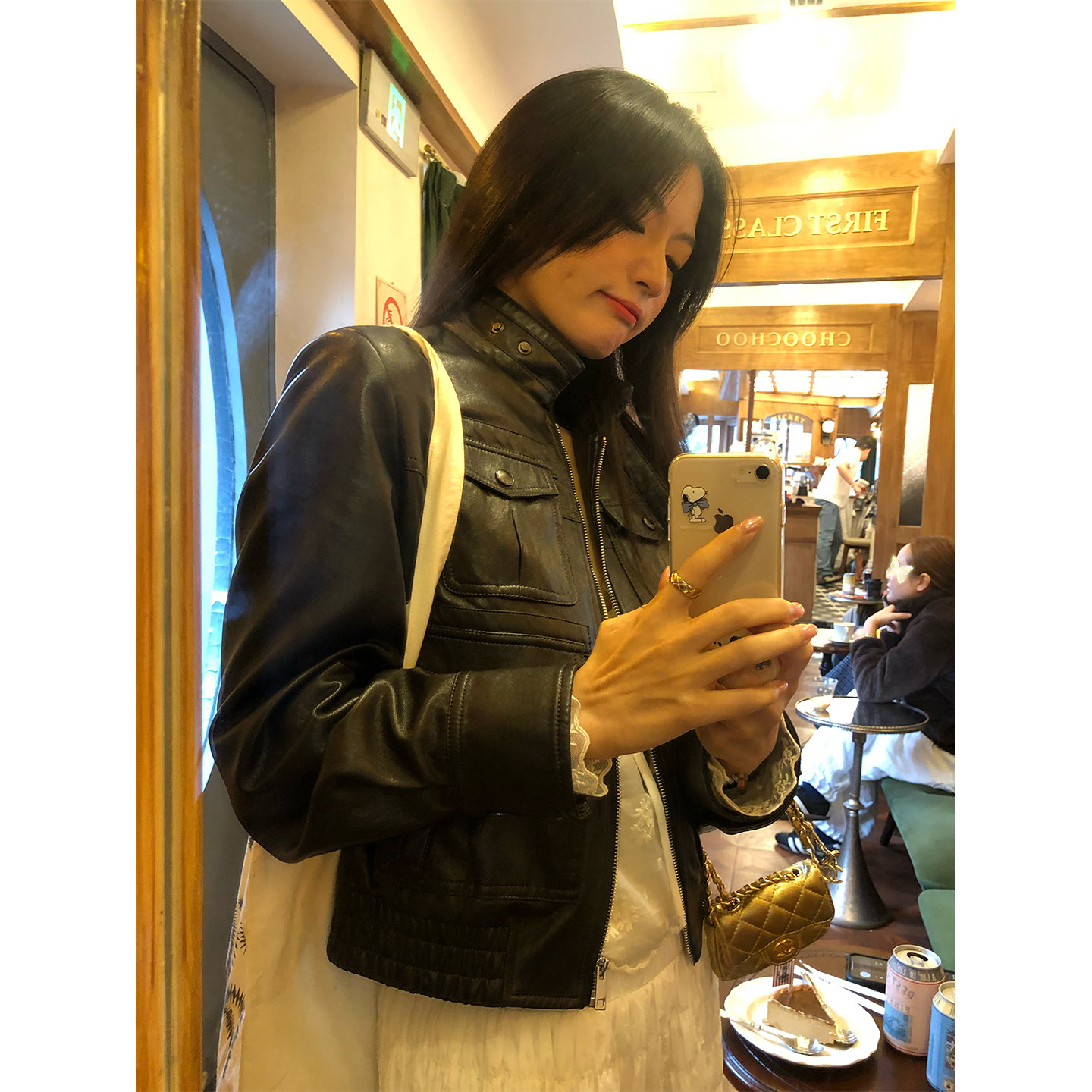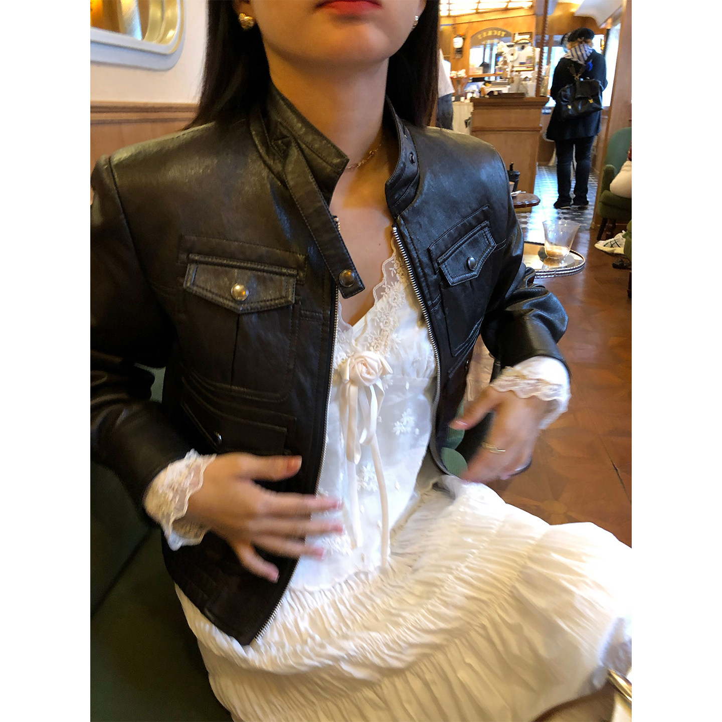 天MSLAN纸感皮衣 26春时尚立领机车黑色皮衣短款廓形显瘦夹克外套女