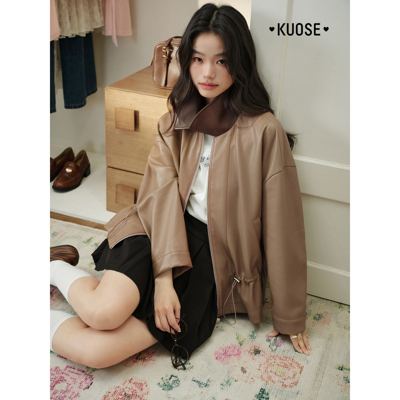 aaaaxbbb 蒸汽列车 复古宽松翻领皮衣高级感韩系慵懒外套百搭女秋