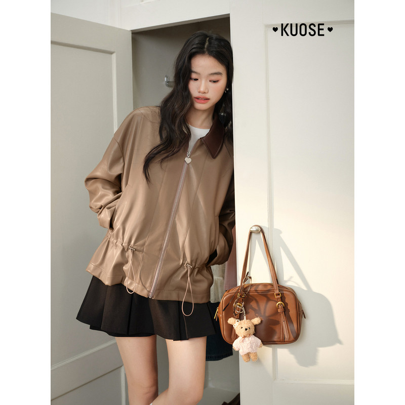 天猫阔色卡其色pu皮翻领美拉德外套女2026春季新款抽绳收腰皮衣上衣秋