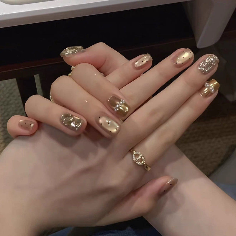 淘纯手工美甲穿戴甲焦糖棕2026新款高级感轻奢闪钻法式贴片冰咖碎金