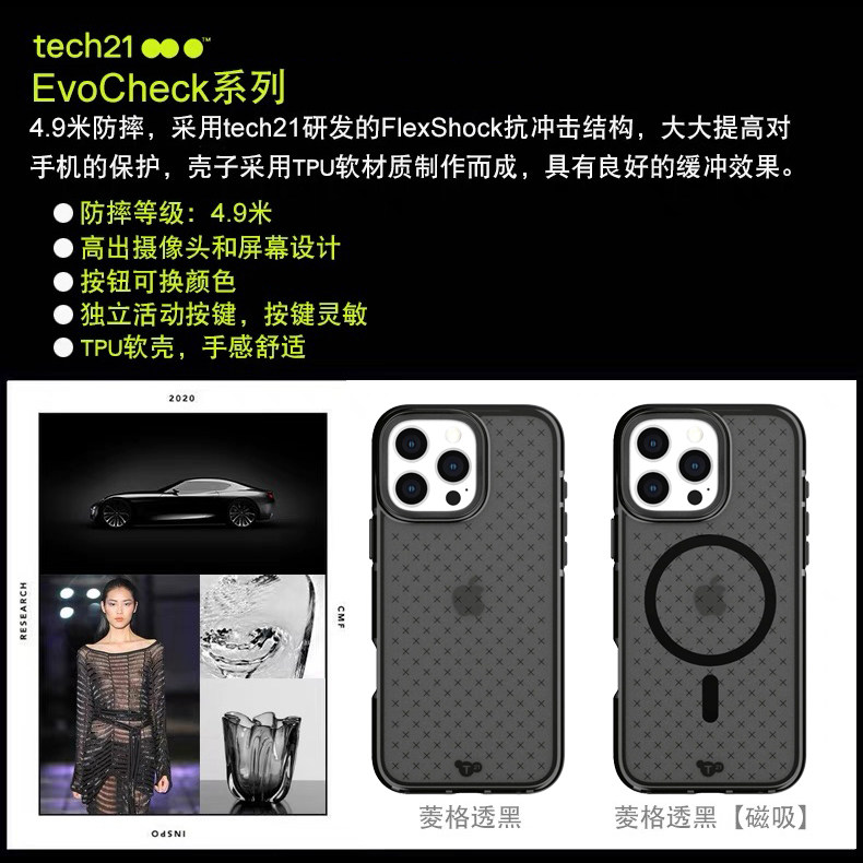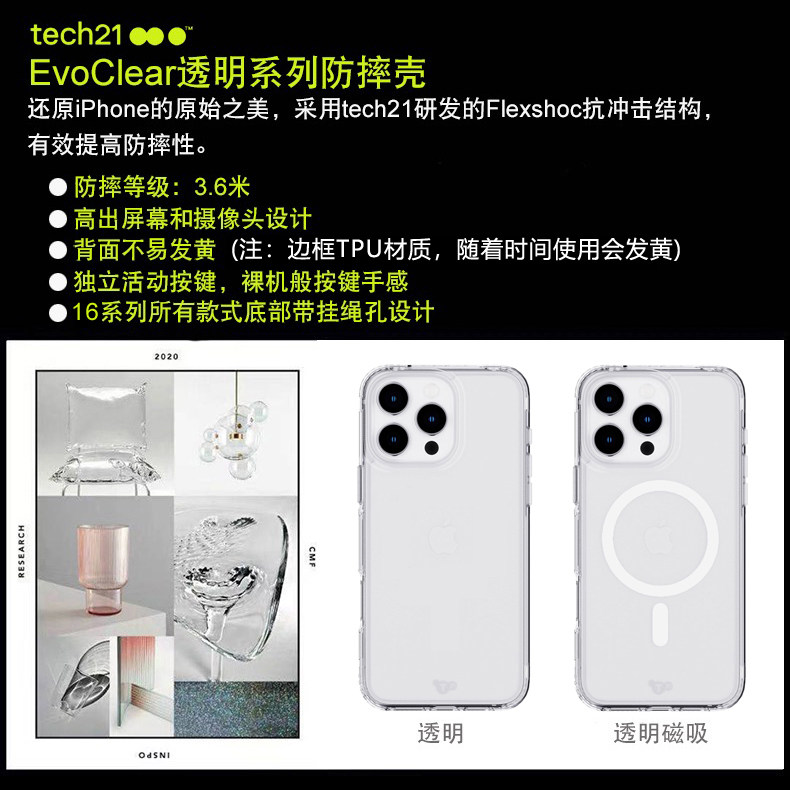 tech21手机壳专为苹果iPhone系列打造,兼容iPhone 17 Pro Max、16 Pro、15、14及Air等多款机型,提供透明硅胶软壳、磁吸硬壳等多种款式选择。采用高品质环保材料,兼具防摔抗震与轻薄贴合特性,精准开孔确保充电、按键操作顺畅。透明设计完美展现手机原色,同时具备抗黄变技术,持久如新。部分型号内置磁吸环,兼容MagSafe配件,充电更便捷。无论是日常防护还是户外使用,tech21都能为您的爱机提供全方位保护,兼顾美观与实用,是果粉的理想之选。