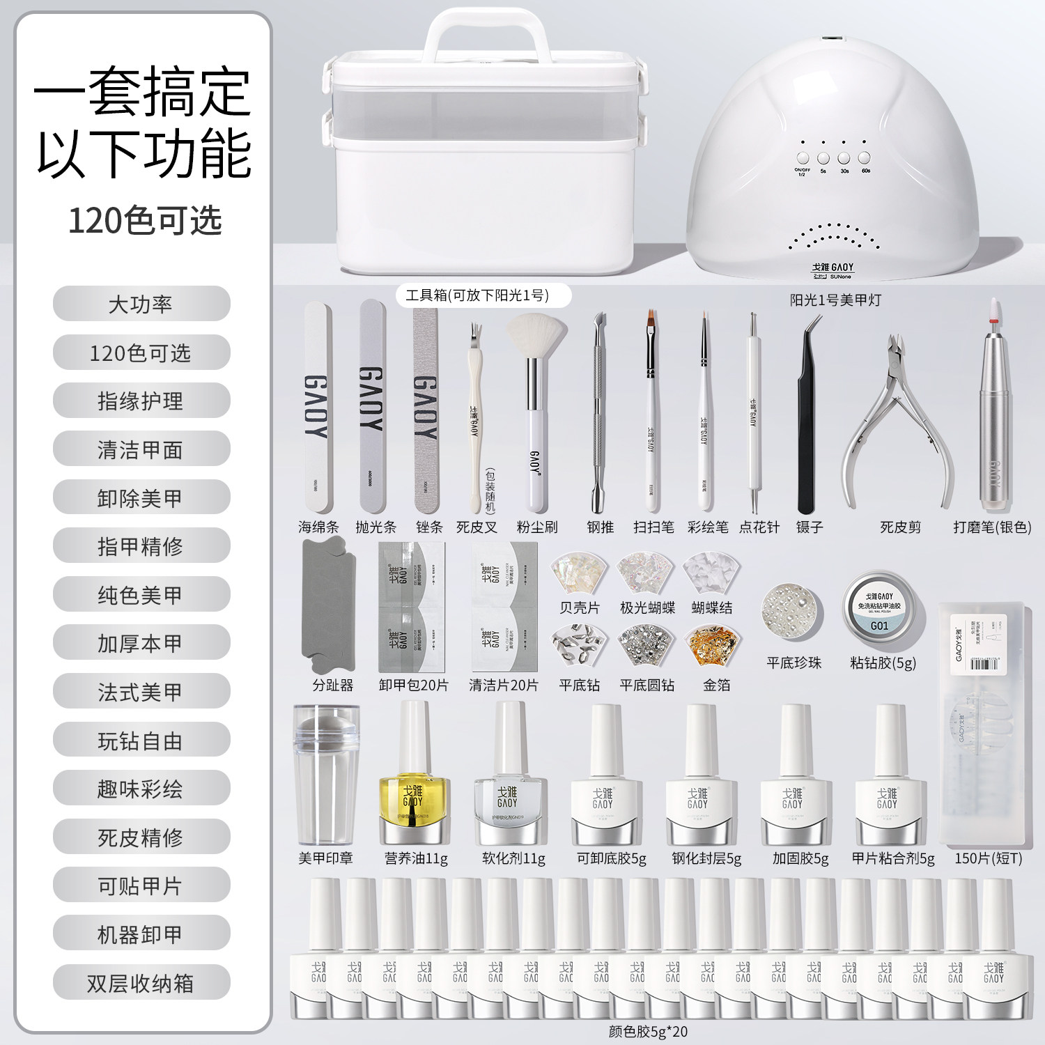 Gaoy戈雅美甲套装2026新款专为美甲店及专业美甲师打造,是一套功能齐全、高效耐用的光疗美甲全套工具。套装包含高品质甲油胶、多功能光疗烤灯、打磨机、清洁笔、底胶封层等全套配件,满足从基础护理到创意彩绘的全流程需求。其2026款光疗机采用智能感应与多档定时设计,36W大功率快速固化,提升工作效率。产品色彩丰富、色泽饱满,持久不脱落,安全环保无刺激。整体设计兼顾专业性与实用性,是开店创业或升级设备的首选,助力打造精致美甲作品,提升顾客满意度与店铺竞争力。
