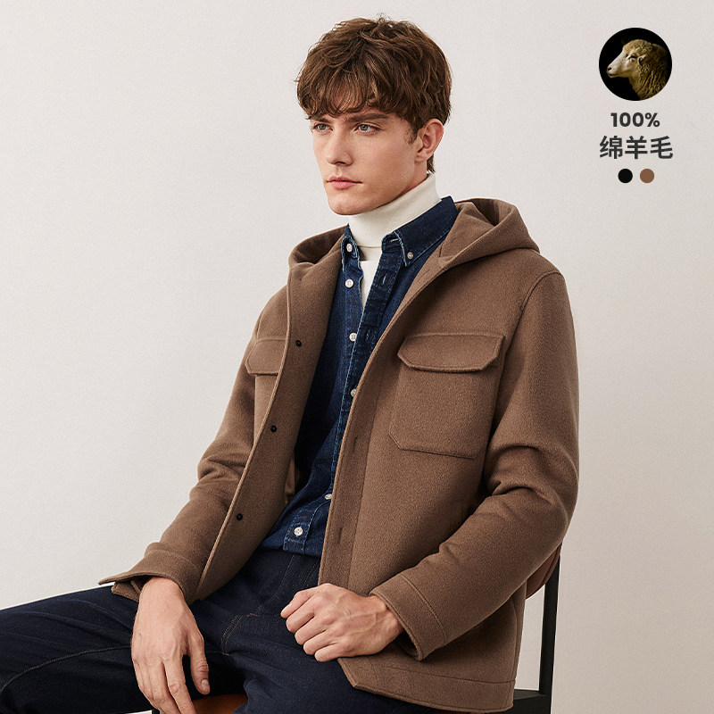 100%绵羊毛单排扣翻领夹克男秋冬美式宽松通勤双面羊毛呢短款大衣