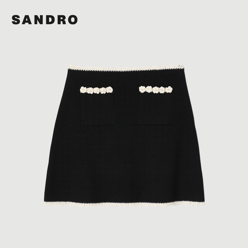 天猫SANDRO2025秋冬女装法式黑色仿珠饰花朵口袋花边修身针织半身裙
