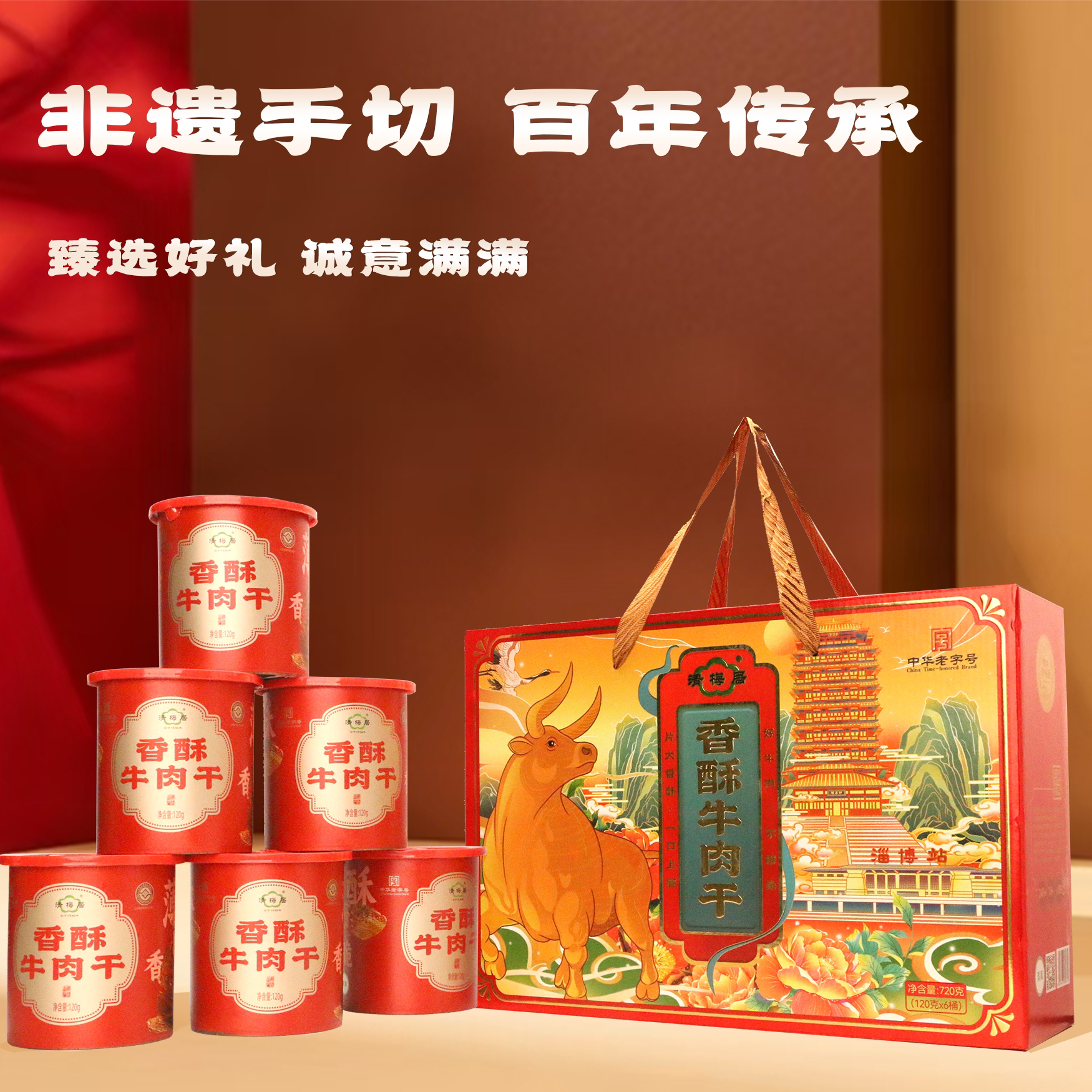 天猫清梅居鸿运国潮香酥牛肉干礼盒120gX6桶节日礼品淄博特产清真食品