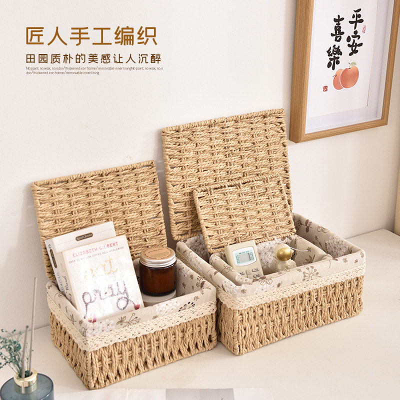藤编时尚桌面收纳盒日式篮子网红实木带盖篮筐竹编家用茶几零食