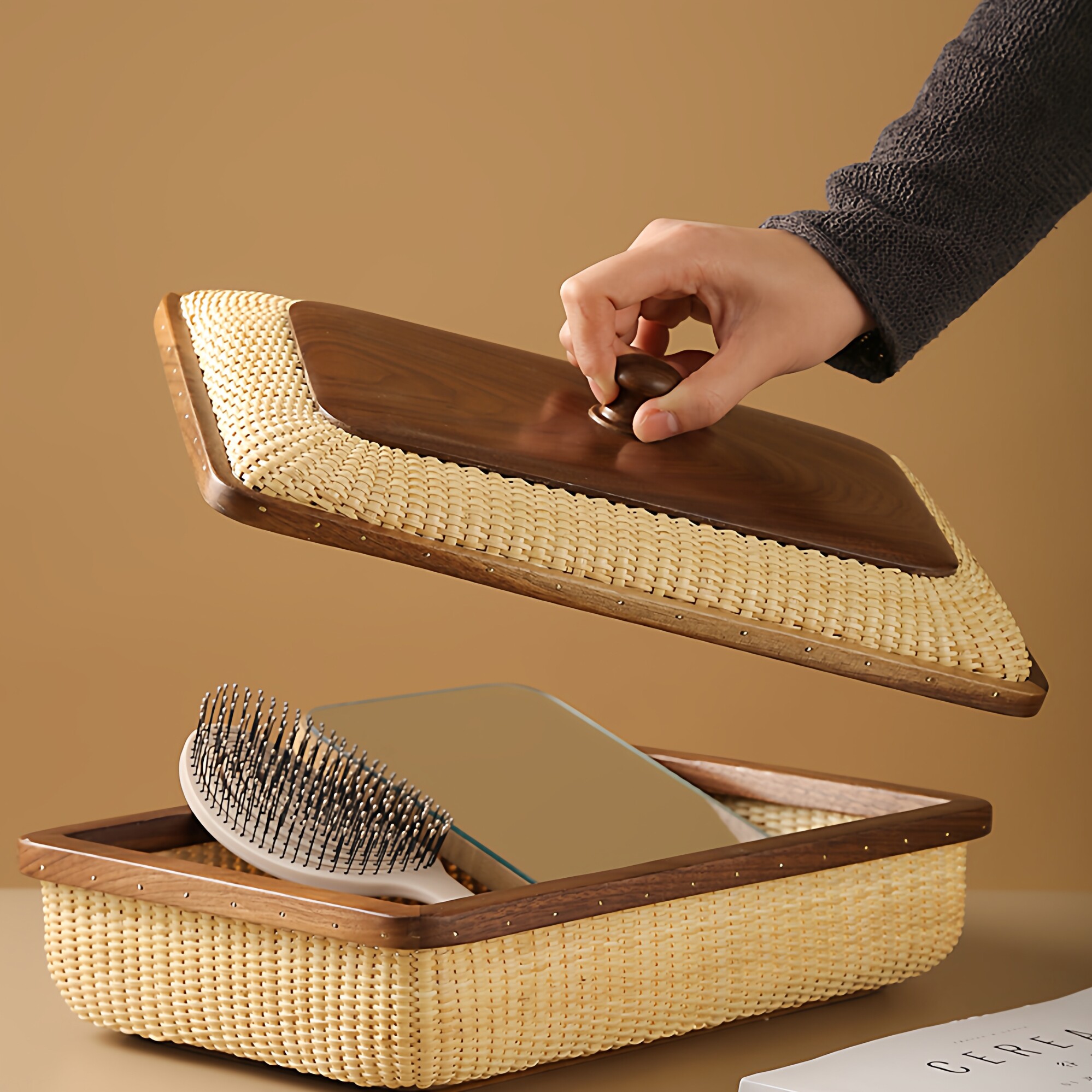 这款藤编时尚桌面收纳盒,融合日式极简美学与实用功能,采用天然藤条与实木框架精工编织而成,环保耐用,质感温润。带盖设计防尘防潮,既能收纳零食、文具、化妆品等小物,也可作茶几装饰篮,提升家居格调。竹编纹理细腻自然,搭配原木色调,轻松融入北欧、侘寂或新中式风格空间。小巧精致却不失容量,既是网红家居好物,也是送礼佳选。无论是客厅、卧室还是办公桌,都能为生活增添一份自然雅致与井然有序,是现代人追求品质生活的理想收纳伴侣。