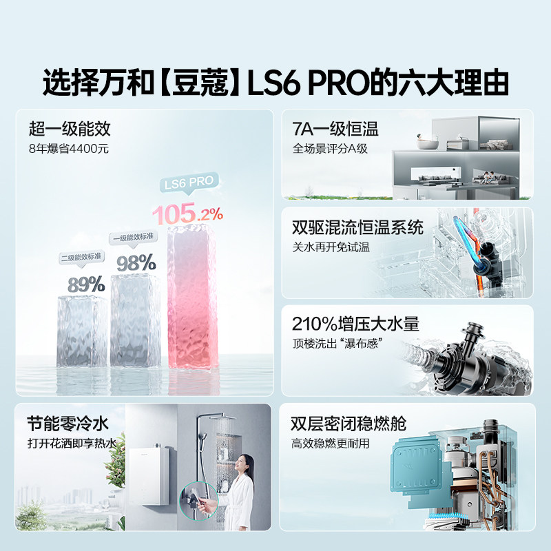 【焕新补贴】万和1级能效零冷水7A恒温燃气热水器LS6PRO,以卓越性能重新定义舒适洗浴。搭载零冷水技术,开机即享热水,告别等待;7A恒温系统精准控温,水温波动小于±0.5℃,四季沐浴更安心。国家一级能效认证,节能省气,环保高效。内置智能增压技术,高层、老房用水无忧,水流强劲澎湃。豆蔻绿时尚外观,小巧机身节省空间,适配多种家居风格。支持手机APP远程操控,预约加热更便捷。现享焕新补贴,升级品质生活,万和LS6PRO让每一度热水都充满科技与贴心。
