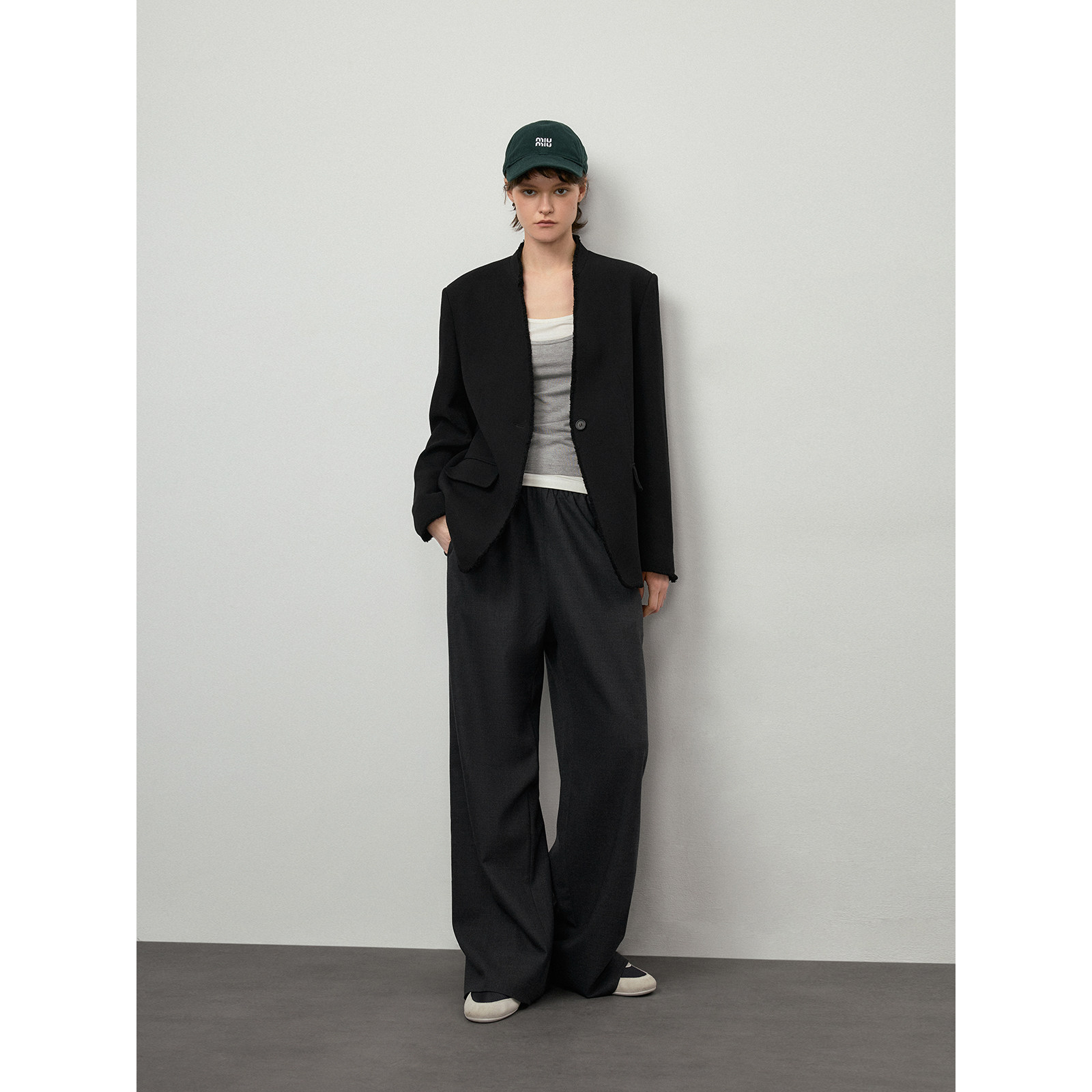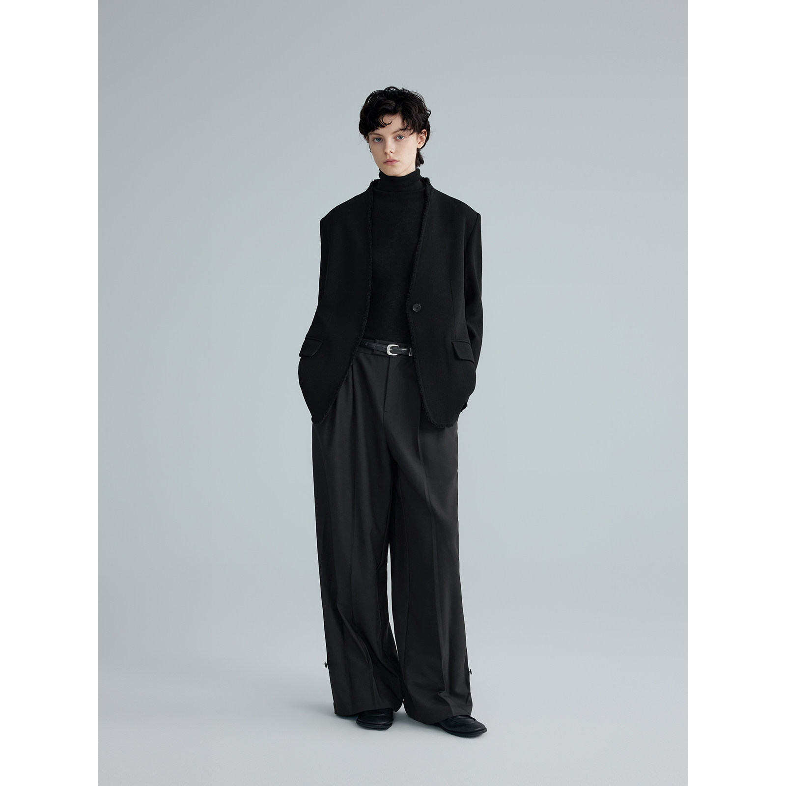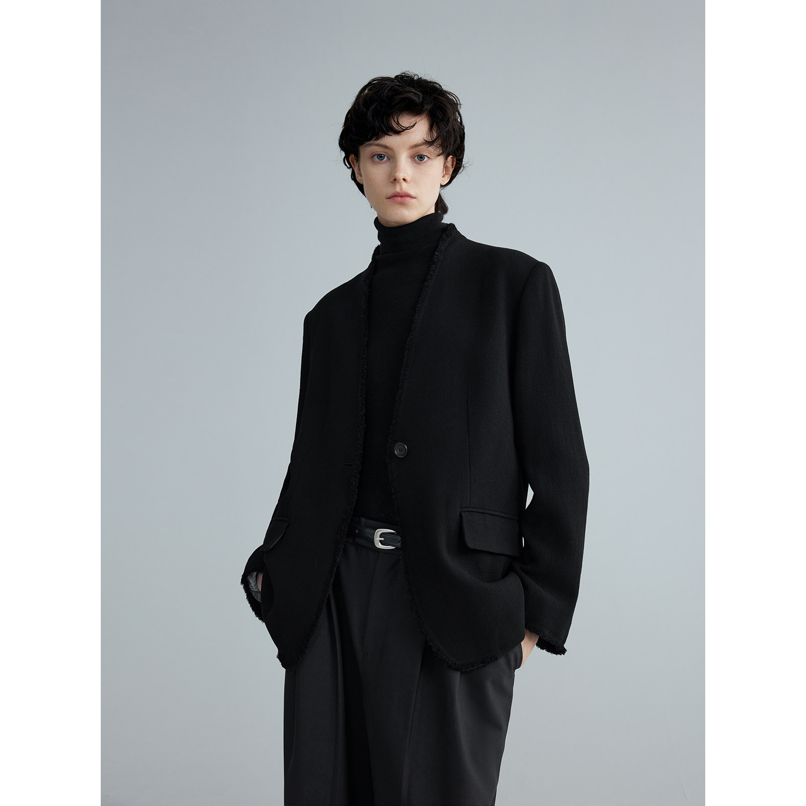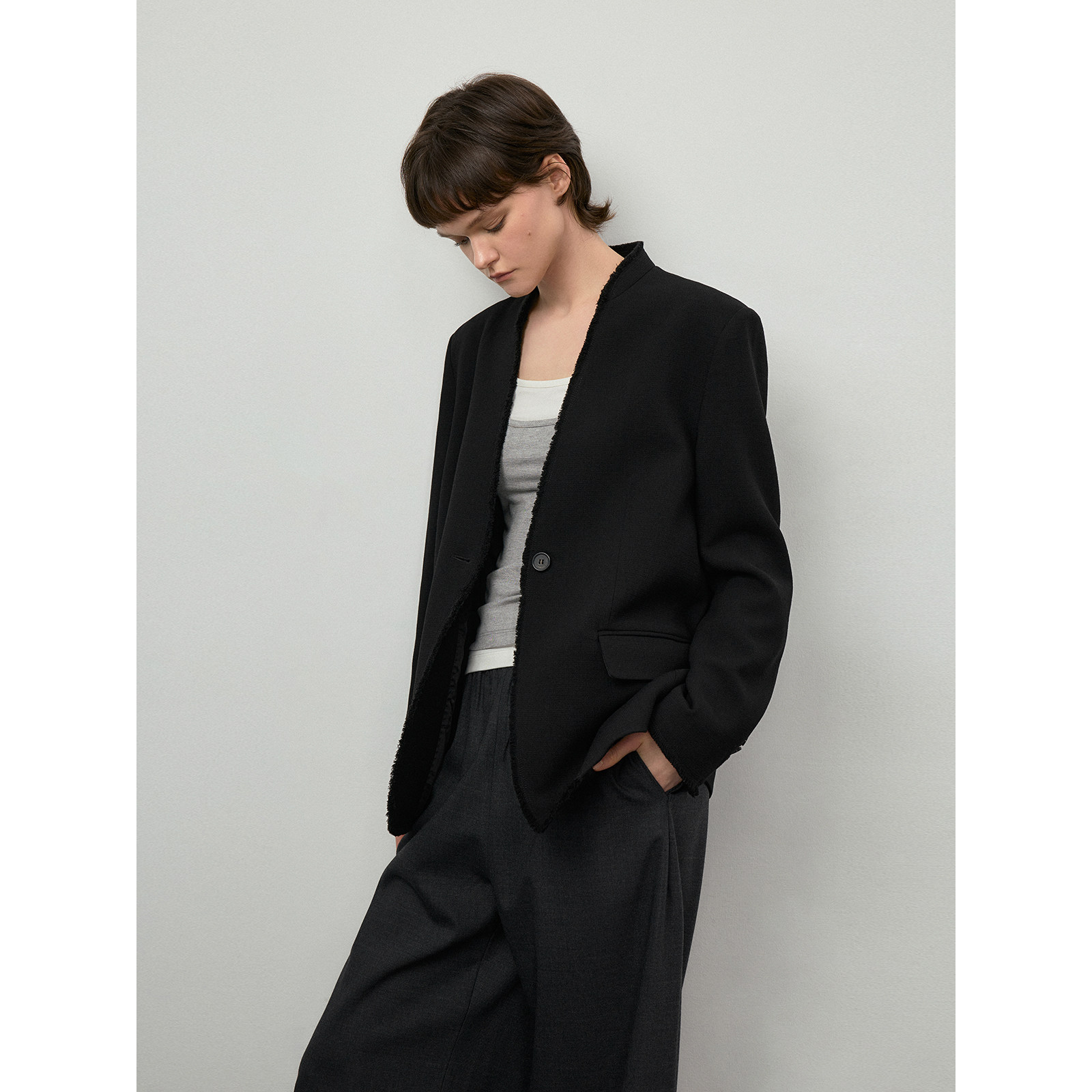 淘宝华吉言【墨尔本】100羊毛纯手工毛边V领宽松垫肩西装外套女春季