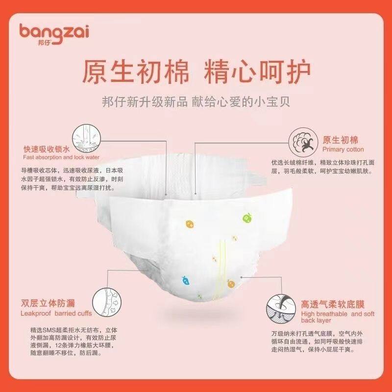 邦仔婴儿纸尿裤专为新生宝宝至学步期宝宝设计,采用超薄透气材质,轻盈贴身,有效减少闷热感,保持小屁屁干爽舒适。内层精选棉柔亲肤表层,温和呵护宝宝娇嫩肌肤,减少摩擦与红臀风险。立体防漏隔边设计,贴合身形,有效防止侧漏,夜间使用更安心。M码60片、L码56片、XL码48片、XXL码44片,满足不同成长阶段需求。快速吸收锁水技术,瞬吸不反渗,持久干爽长达12小时。邦仔纸尿裤,以高品质守护宝宝每一刻舒适,让妈妈更放心。