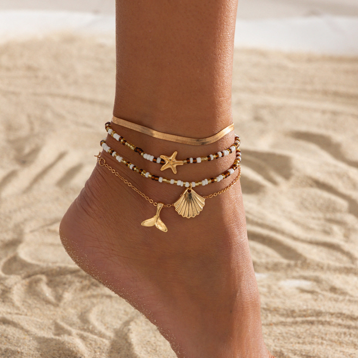 淘宝欧美跨境度假风海星扇贝壳鱼尾吊坠脚链 波西米亚仿珍珠米珠脚饰