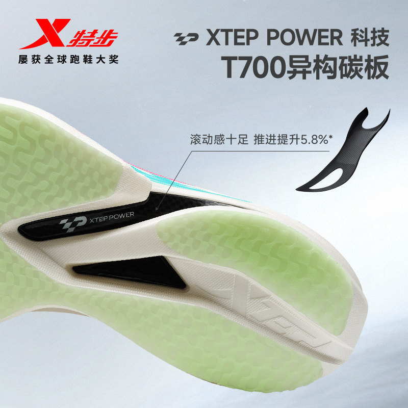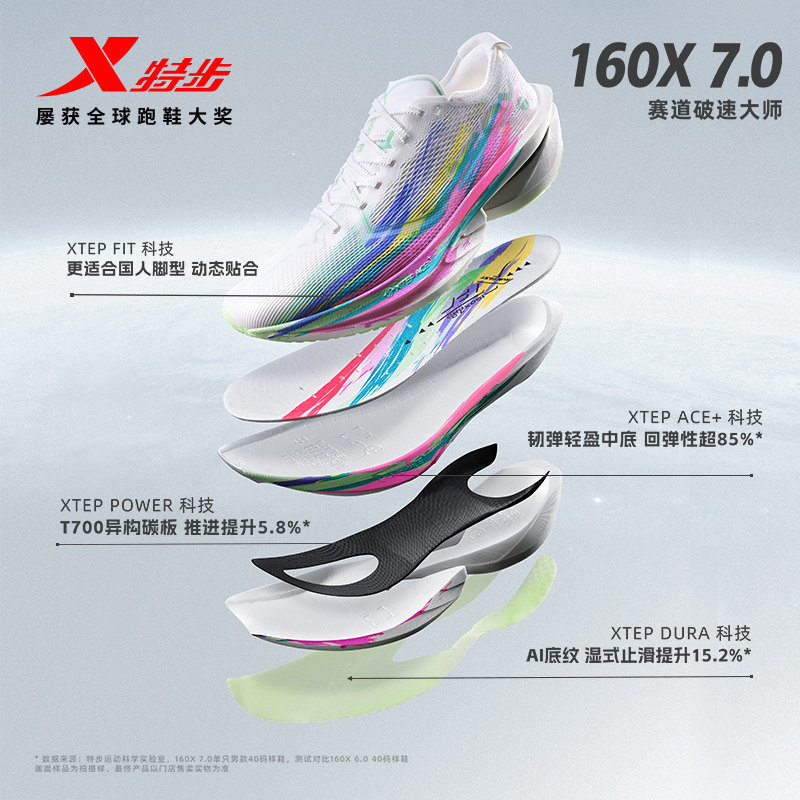 【冠军同款系列】特步160X 7.0竞速碳板跑步鞋,专为追求极致速度的跑者打造。延续冠军基因,搭载全新升级的全掌异构碳板与动力巢PB中底科技,能量回馈高达85%,助力每一步高效推进。鞋面采用轻量化MONO纱材质,透气贴合,减轻足部负担。大底配置耐磨橡胶,抓地力强劲,适应多种路面。作为众多马拉松冠军的同款战靴,160X 7.0集轻量、回弹、稳定于一体,是突破PB的理想之选。无论是全马竞速还是高强度训练,都能为跑者提供澎湃动力与持久支撑,助你在赛道上快人一步,冲向终点。