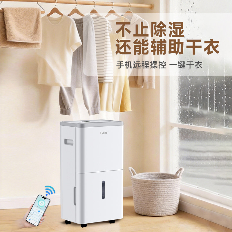 海尔家用除湿机,专为室内潮湿环境设计,适用于地下室、仓库、卧室等多种场景。搭载大功率压缩机,高效抽湿,快速降低空气湿度,有效防止霉变、异味和物品受潮。采用轻音运行技术,工作噪音低至40分贝,营造安静舒适的生活空间。智能湿度感应系统可自动调节除湿强度,节能省电。配备大容量水箱,支持连续排水,使用更便捷。此外,具备干衣模式,快速烘干衣物,应对梅雨季节尤为实用。海尔除湿机集高效、静音、智能于一体,是守护家庭干爽健康的理想之选。