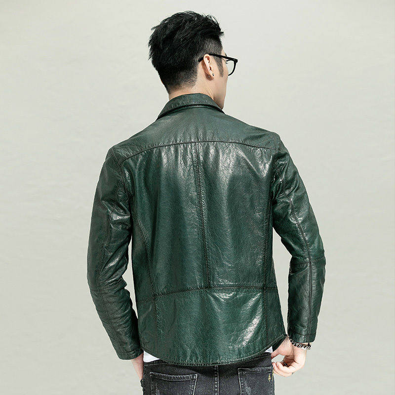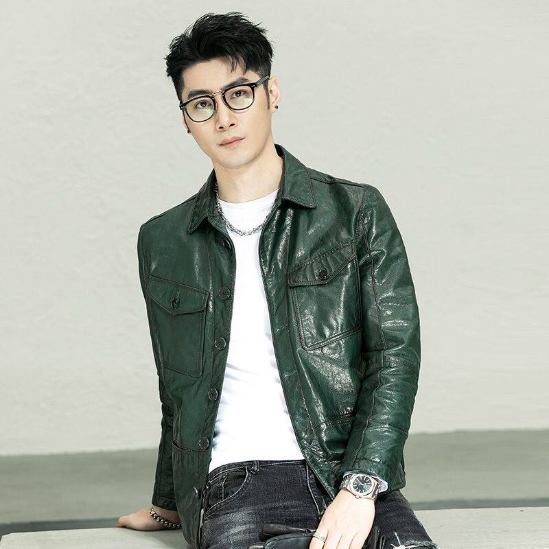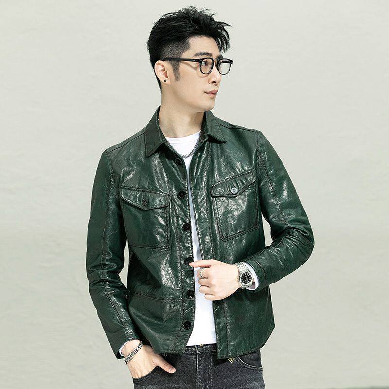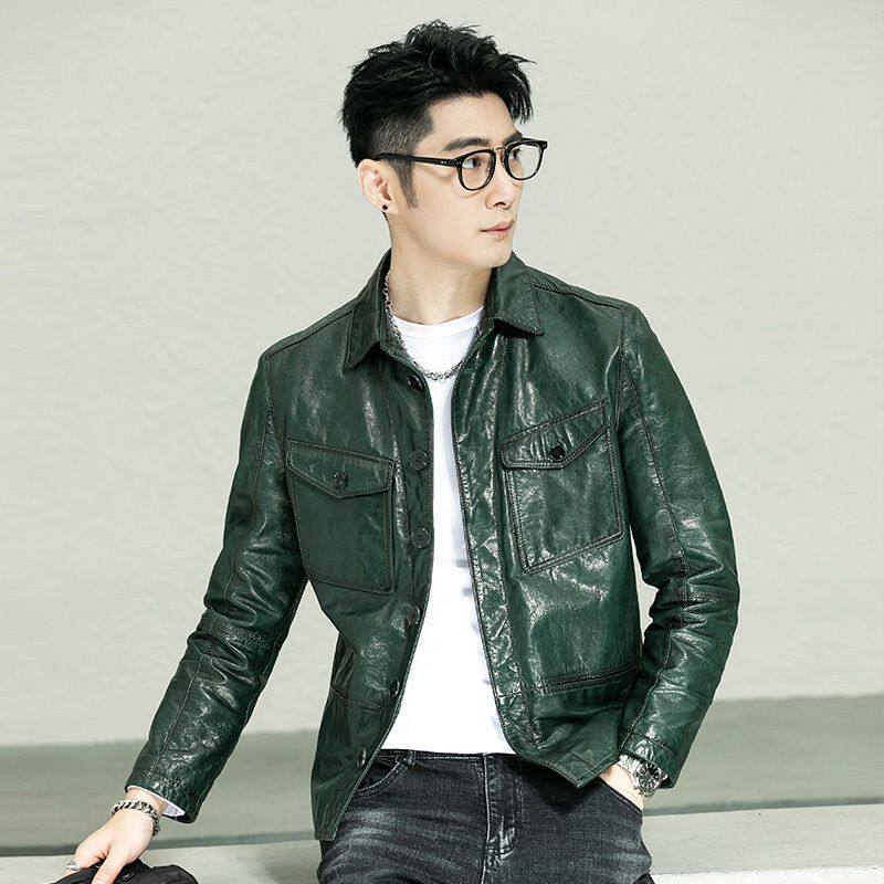淘宝头层牛皮夹克男士真皮皮衣翻领衬衫修身短款油蜡青年机车帅气外套