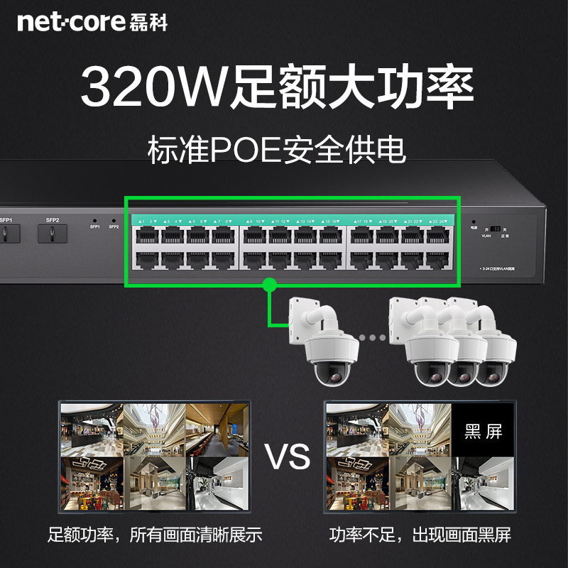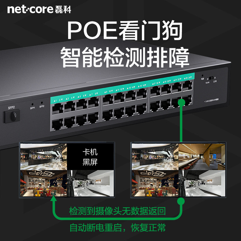 磊科SG2026P是一款专为安防监控设计的26口千兆POE交换机,支持IEEE 802.3af/at国标48V供电标准,可为海康威视、大华、TP-LINK等主流品牌摄像头提供稳定网线供电与数据传输。设备配备24个千兆POE电口和2个千兆光口,支持远距离光纤接入,满足大型监控组网需求。内置AI智能供电管理,自动识别设备功率并优化供电策略,保障系统稳定运行。支持VLAN划分、端口隔离与QoS流量控制,有效提升网络安全性与传输效率。即插即用,安装简便,广泛应用于小区、园区、商铺等场景,是高清监控系统的高效网络中枢。