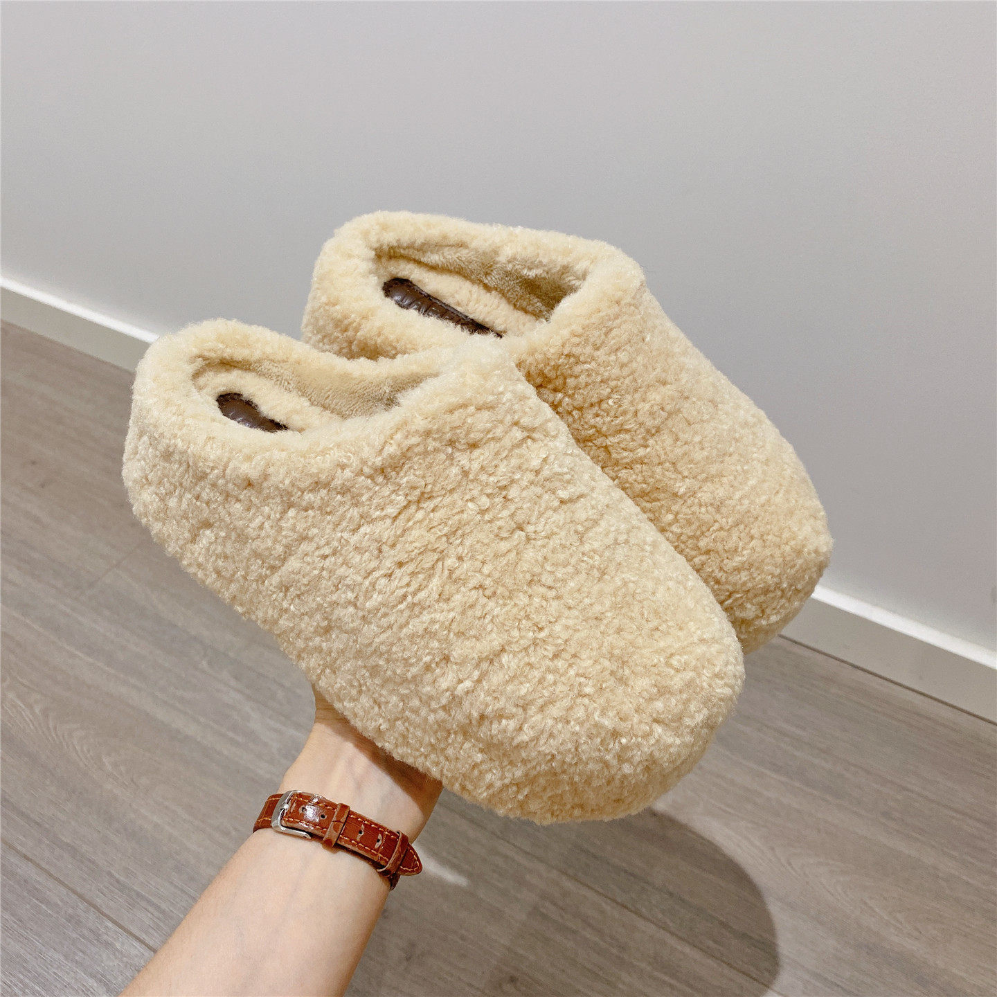 淘撤柜处理真皮厚底毛毛棉拖鞋女2025冬季新款外穿保暖懒人包头半托