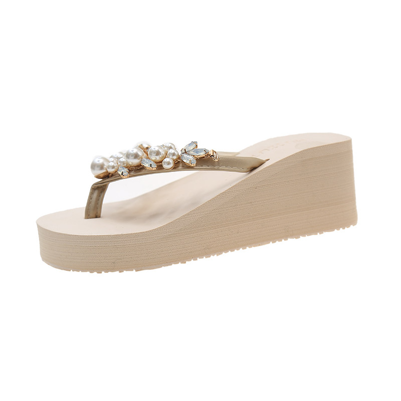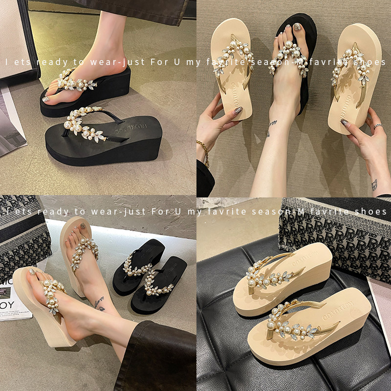 淘宝珍珠水钻凉拖鞋女2024夏季外穿韩版防滑厚底沙滩人字拖女夹脚拖鞋
