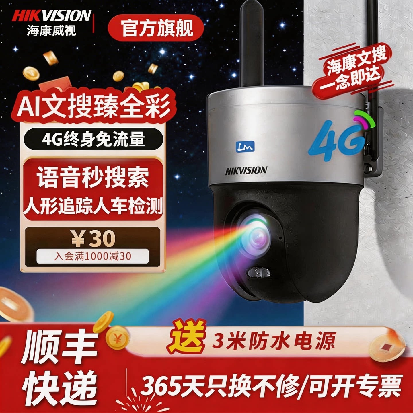天猫海康威视4G免流球机监控文搜摄像头室外防水高清臻全彩2夜视360度