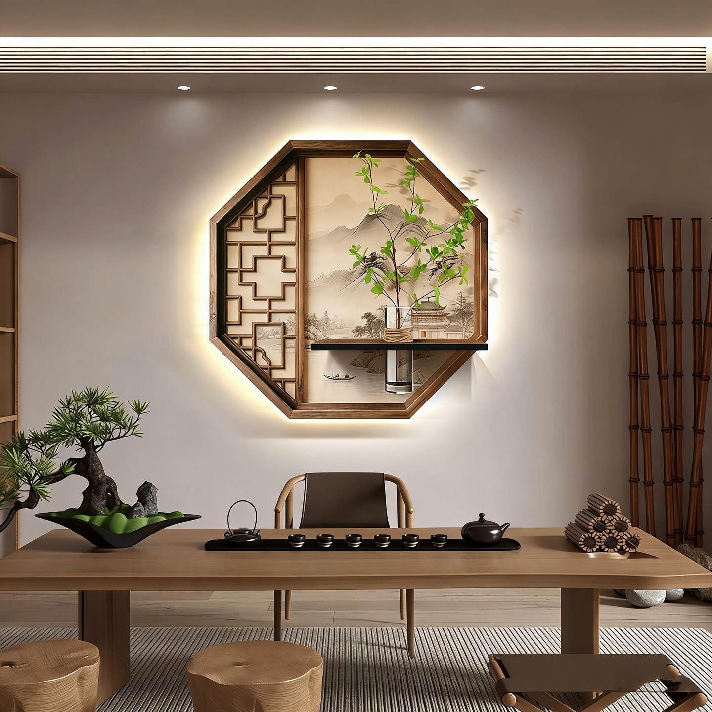 宋代美学茶室氛围布置挂画玄关走道背景墙壁灯画茶楼带绿植装饰画