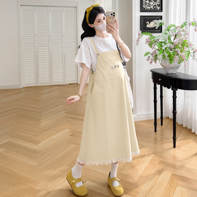 孕妇连衣裙夏季2026新款时尚宽松遮肚拼接纯棉孕妇装假两件背带裙