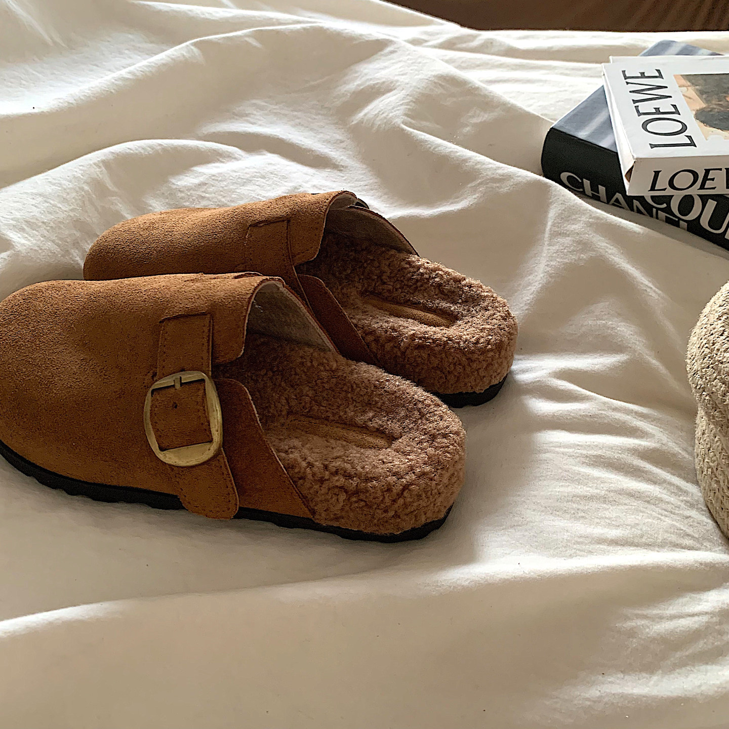 厚底加绒勃肯半拖鞋女外穿2025冬季新款保暖毛毛鞋一脚蹬包头棉拖
