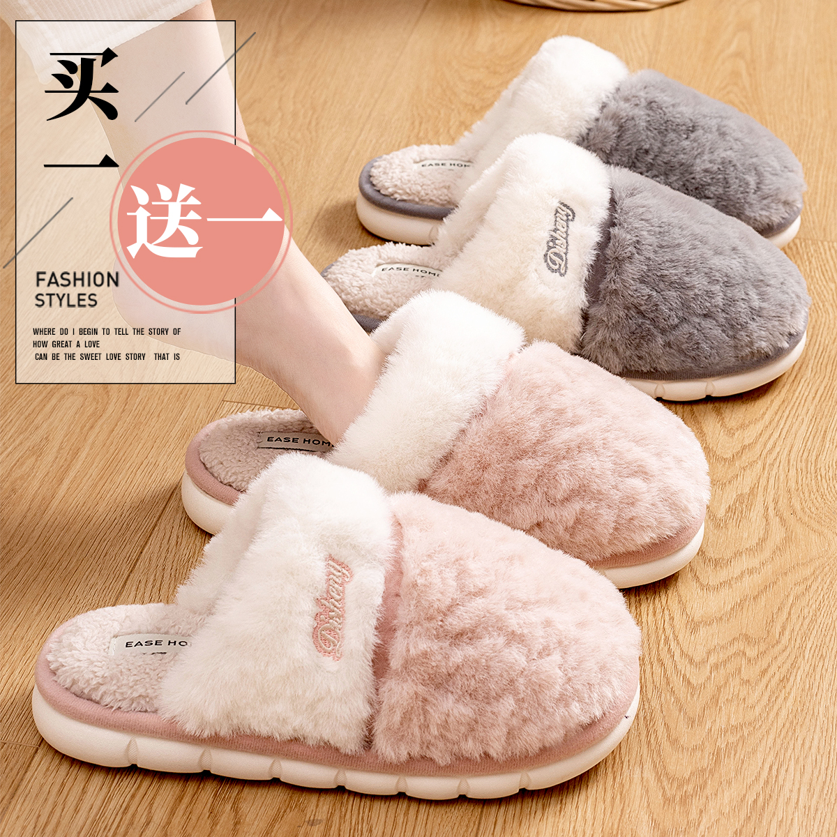 天猫买1送1棉拖鞋情侣家居一对2025新款冬室内保暖防滑加绒毛拖鞋女款