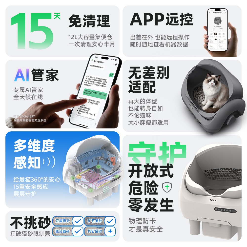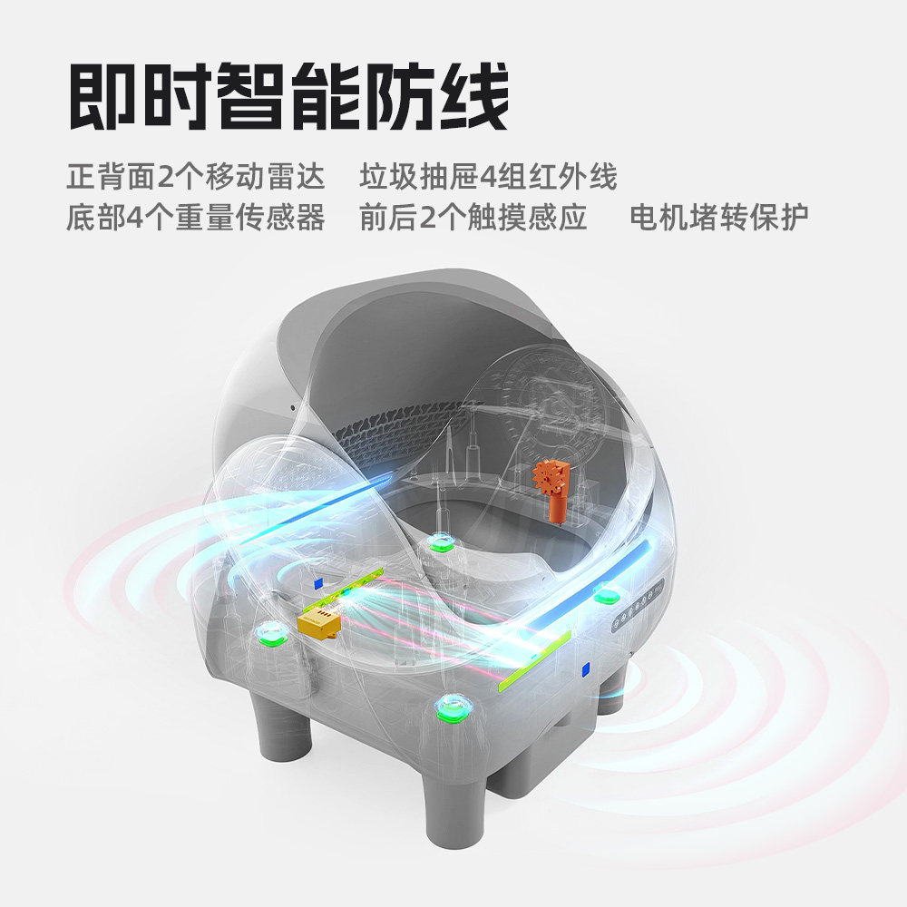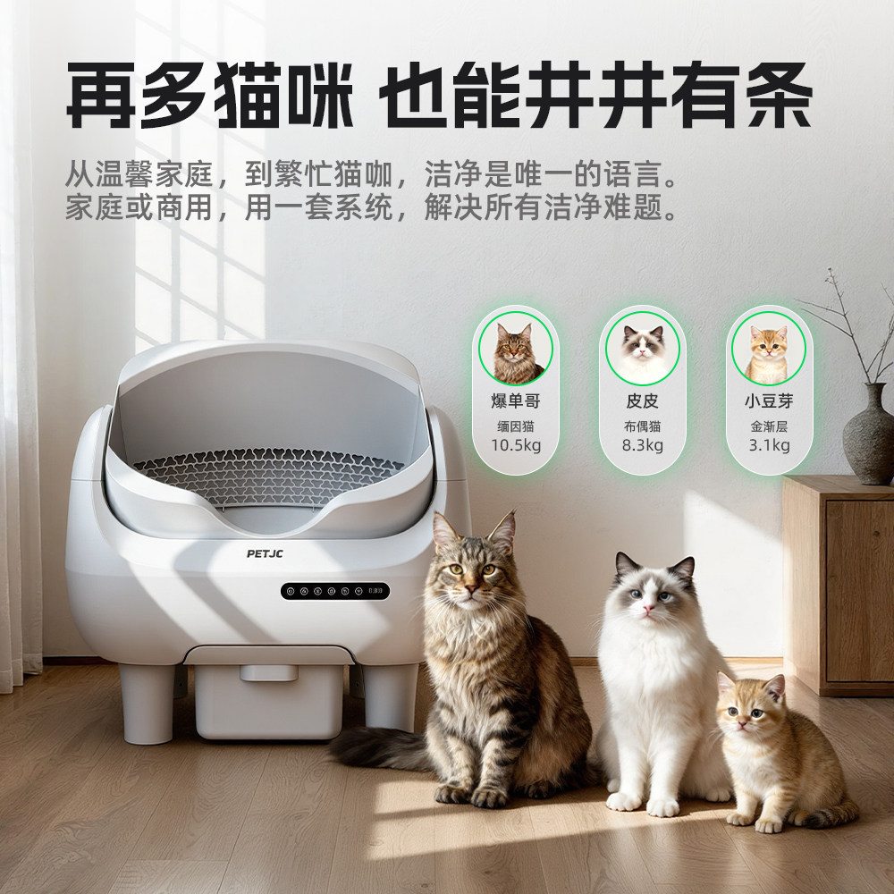 聚宠大嘴自动猫砂盆是一款专为多猫家庭或大型猫咪设计的智能电动猫厕所,采用开放式超大号结构,空间宽敞,猫咪进出轻松自如。配备智能感应系统,猫咪离开后自动启动清理程序,高效铲砂、集中收纳,有效减少异味扩散,保持家居清新。防臭设计结合密封集便仓,锁味抑菌,使用更安心。支持APP远程监控,随时掌握猫咪如厕情况。运行低噪,安全防夹,断电保护功能保障使用安全。聚宠大嘴以人性化设计与智能科技,为猫咪提供洁净舒适的如厕环境,让养宠生活更省心、更卫生。
