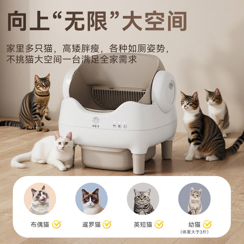喵智洁全自动智能猫砂盆是一款专为多猫家庭或大体型猫咪设计的大号半开放式猫厕所,集智能感应、自动铲屎、除臭防溅于一体。采用半开放结构,兼顾隐私与通风,有效防止猫砂带出和尿液飞溅。内置智能感应系统,猫咪离开后自动启动清理程序,保持猫砂盆洁净无味。可拆洗设计让清洁更便捷,滤网与集便盒轻松拆卸,支持水洗,杜绝细菌滋生。静音运行,不打扰居家生活。适配多种猫砂,操作简单,APP远程监控,实时掌握猫咪如厕情况。喵智洁,让养宠更省心、更卫生。