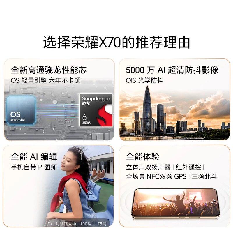 天猫【领国补消费券享优惠】HONOR/荣耀X70 5G智能手机十面抗摔防水8300mAh大电池5000万AI超清防抖影像AI荣耀X70
