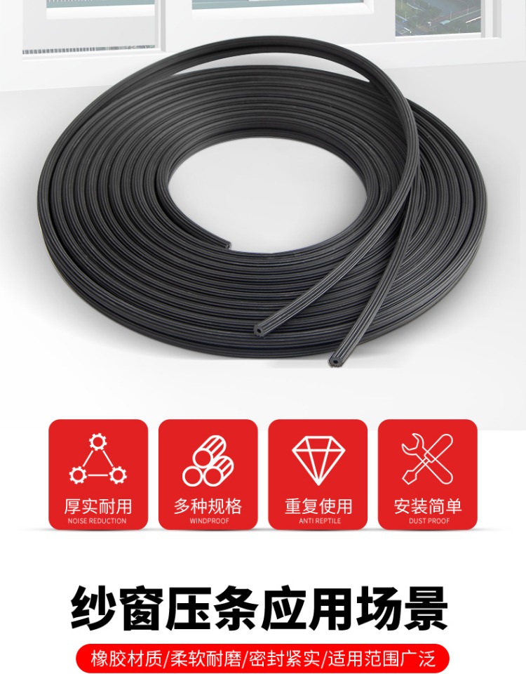 窗纱网压条是门窗安装中的关键配件,主要用于将纱网牢固固定于塑钢、铝合金等窗框上。通常由优质PVC或橡胶材质制成,具备良好的柔韧性与耐候性,能紧密嵌入窗框槽口,确保纱网平整无皱。搭配皮胶条或卡条使用,可增强密封性,有效防尘、防蚊、透气。安装简便,只需将压条压入型材轨道即可,广泛应用于家庭、办公等场所的门窗改造与维护。该配件不仅提升窗户整体美观度,还延长纱网使用寿命,是门窗密封系统的实用辅助工具,保障室内环境舒适安全。