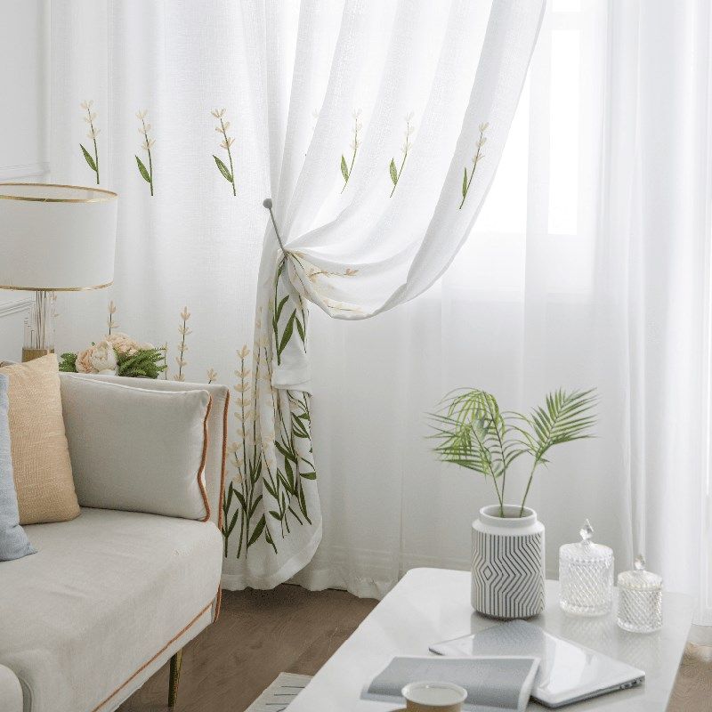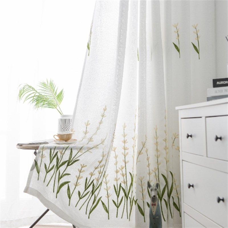 淘宝透光不透人免打孔窗纱田园小清新白纱半遮光卧室绣花飘窗窗帘纱帘
