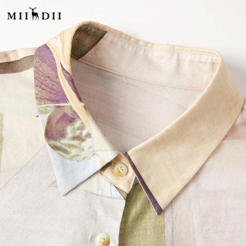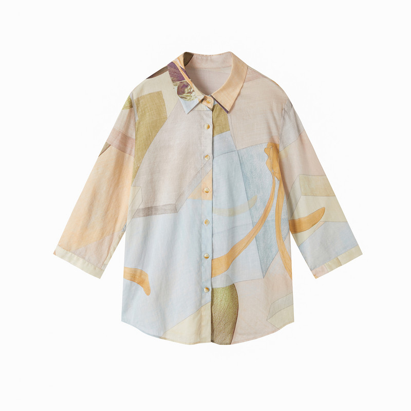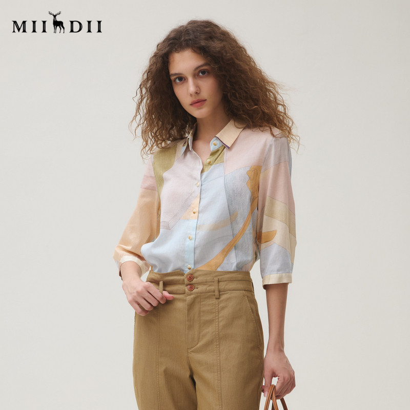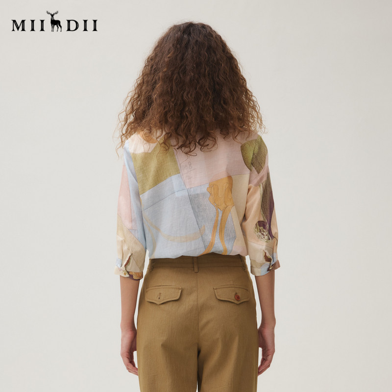 天猫谜底衬衣七分袖女2025秋新品复古通勤印花合体100棉衬衫253MC1008
