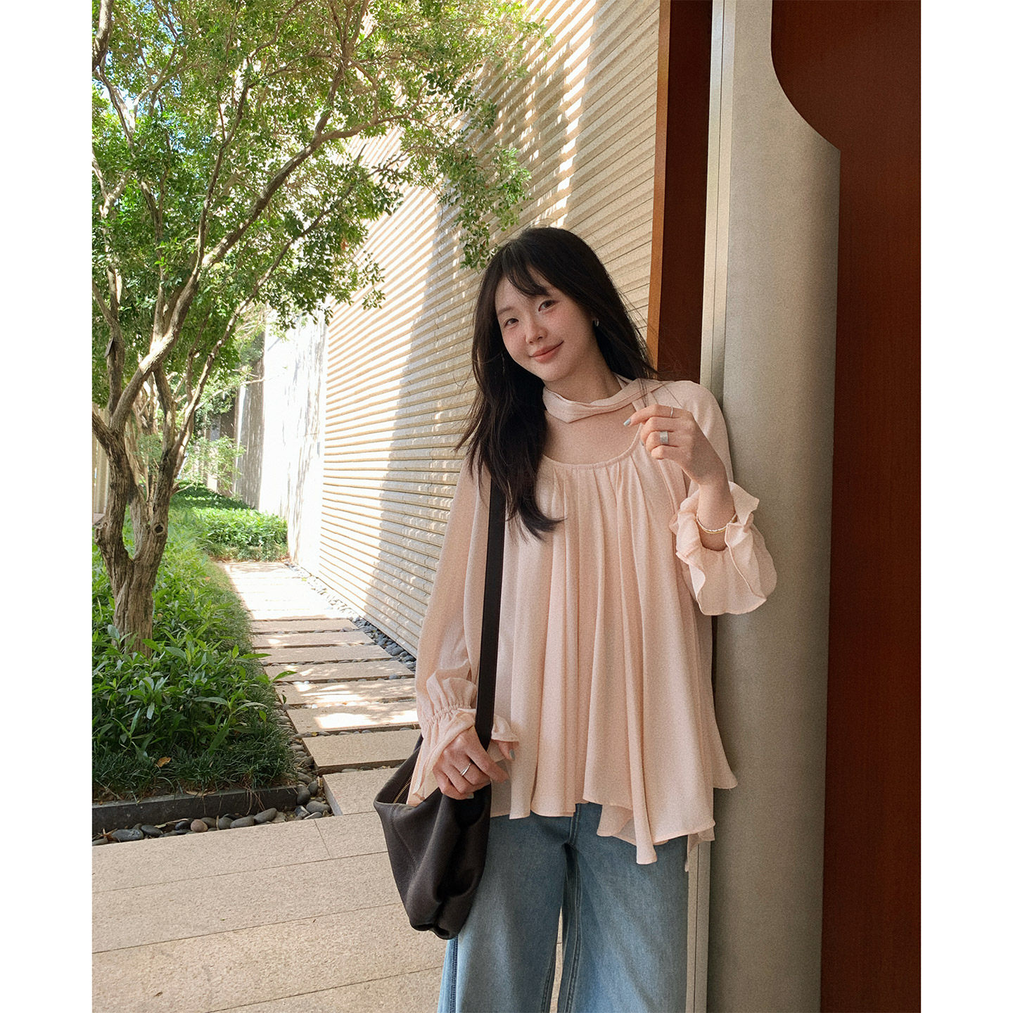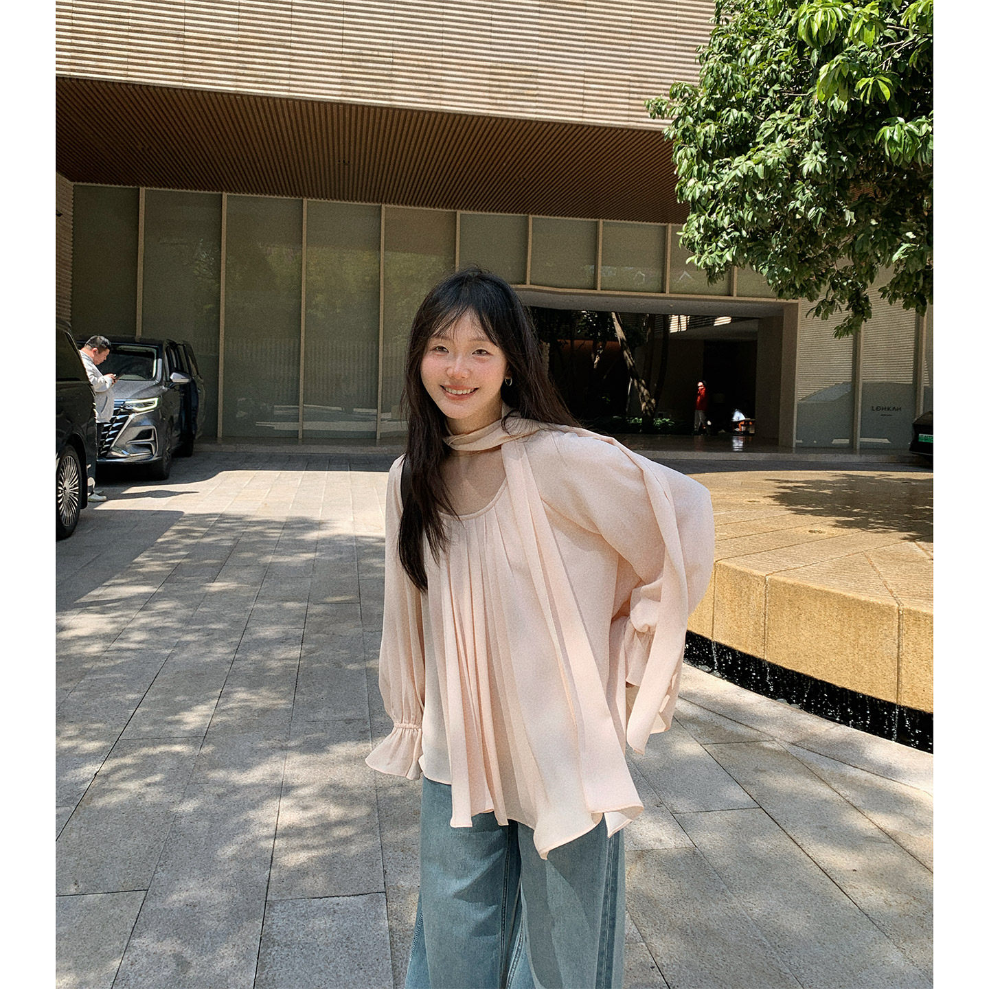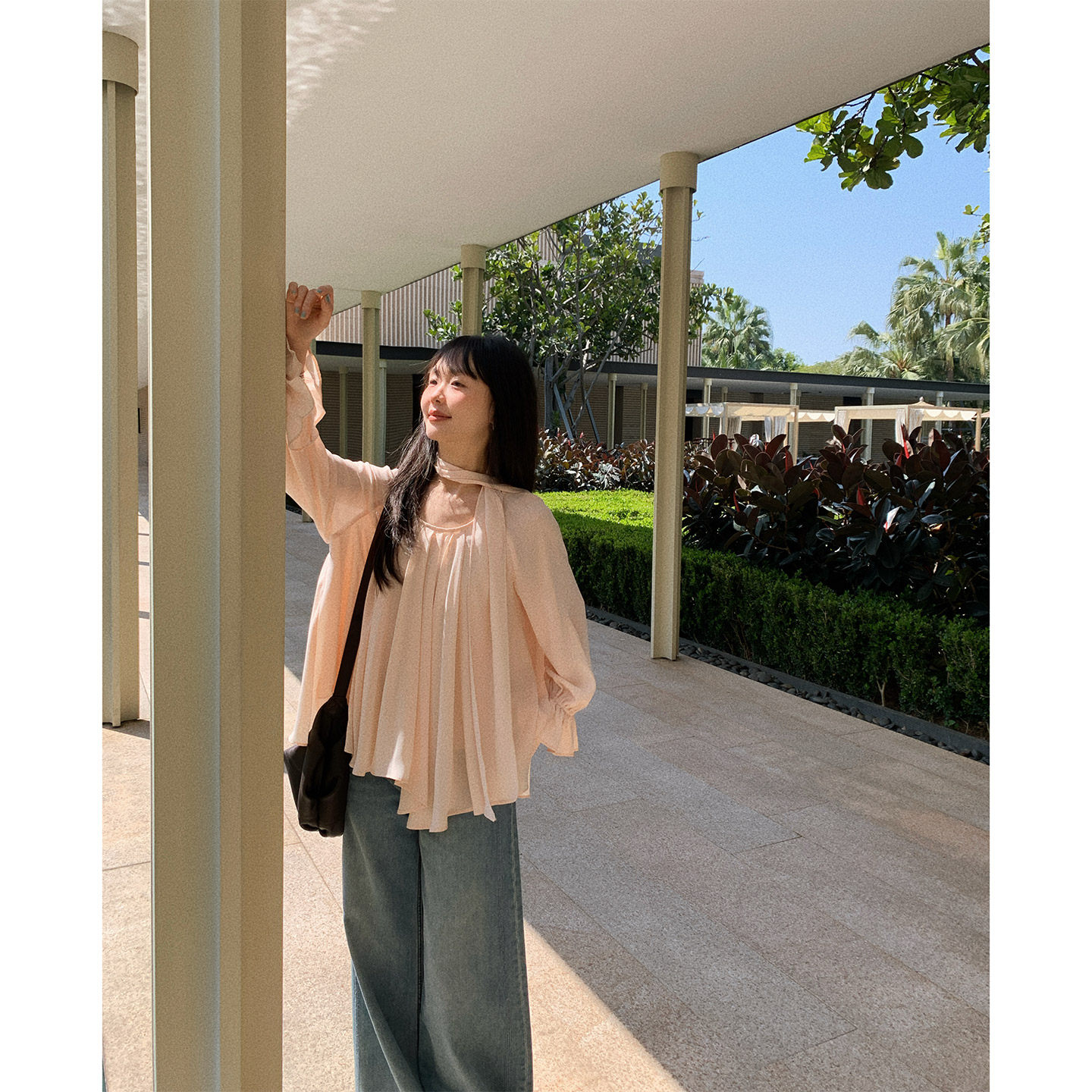 淘宝一三良品小个子 甜美温柔风粉色长袖浪漫宽松飘带仙仙衬衫上衣女