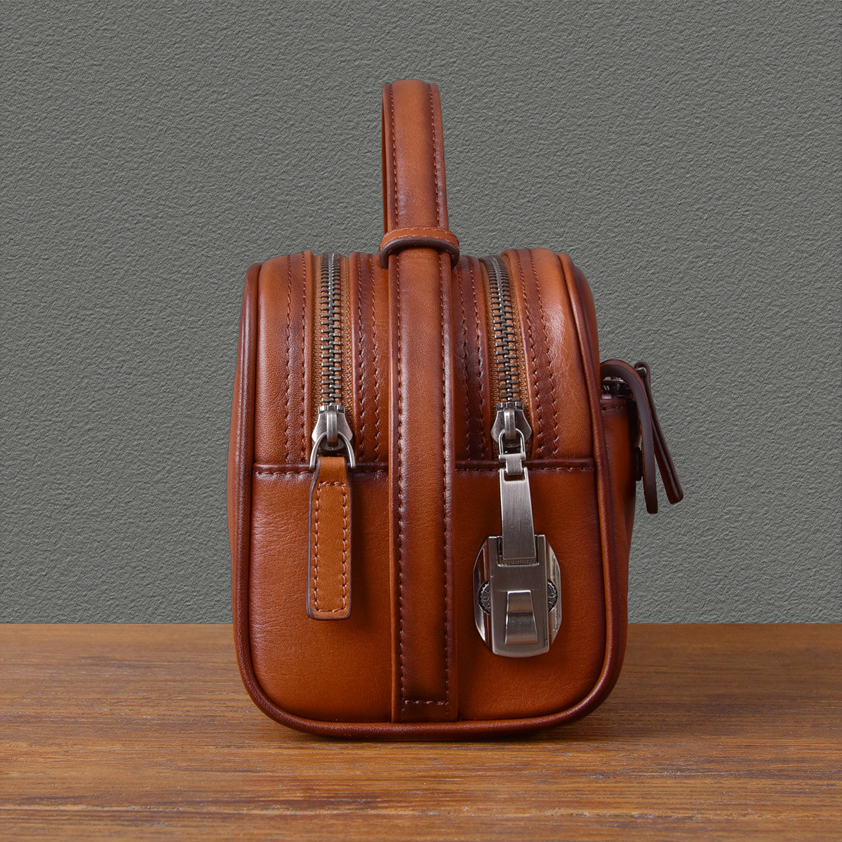 二十四街复古风潮流植鞣擦色牛皮手拎包,融合经典复古美学与现代实用设计,精选优质植鞣牛皮,经手工擦色工艺打造独特复古质感,随使用时间愈发温润光泽。包身线条流畅,多隔层设计合理分区,轻松收纳手机、钱包、钥匙等随身物品,内置带锁结构,安全便捷。可手拎、可手拿,适配通勤、约会、旅行等多种场合。细节处彰显匠心,金属配件精致耐用,复古黄铜锁扣提升整体质感。兼具颜值与功能性,是追求品质与个性的都市潮人的理想之选,诠释低调而优雅的复古时尚态度。