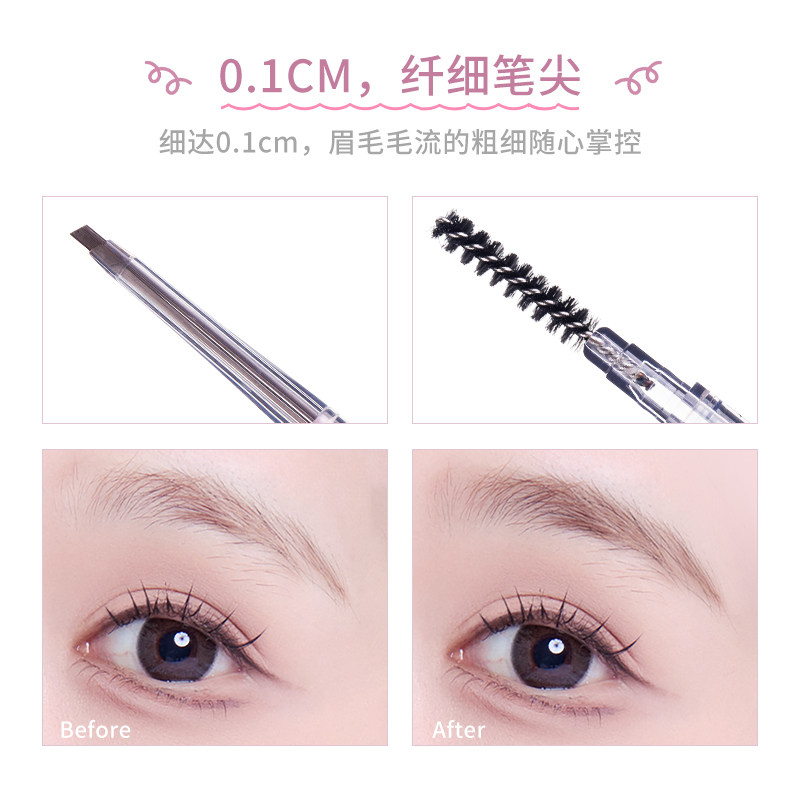 FLORTTE花洛莉亚双头极细眉笔眉粉,专为精致眉妆设计,一端为0.8mm极细笔芯,轻松勾勒根根分明的自然眉形,精准填补毛流空隙;另一端为细腻眉粉,柔化眉峰,打造雾感渐变效果。防水防汗配方,持久不脱色,全天持妆无惧出油出汗。笔触顺滑不结块,新手也能轻松上手。小巧便携,满足日常通勤与外出补妆需求。花洛莉亚以高性价比著称,融合日系细腻工艺,为现代女性提供自然、立体、持久的眉妆体验,是打造清新自然或精致立体眉形的不二之选。