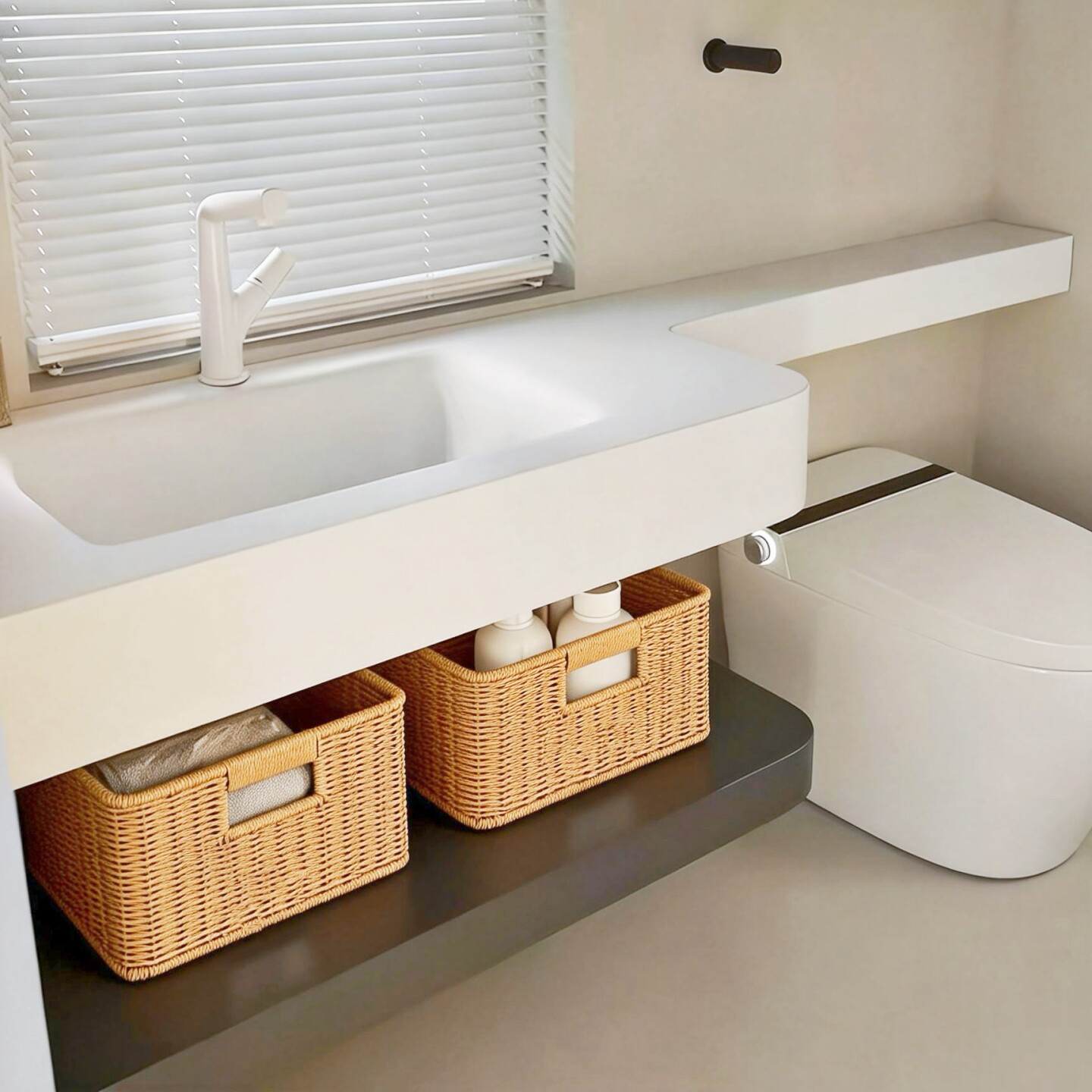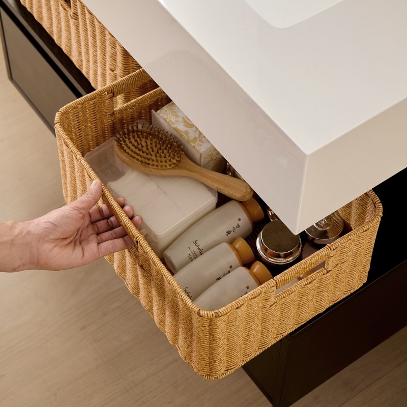 这款浴室柜下编织收纳筐,采用环保仿藤材质精制而成,外观简约雅致,完美契合酒店风卫生间的轻奢格调。其精巧的编织工艺不仅坚固耐用,更增添自然质朴的质感,轻松融入现代家居环境。专为浴室柜下方空间设计,巧妙利用闲置区域,有效收纳毛巾、洗漱用品、清洁工具等物品,保持台面整洁有序。底部设有防滑垫,保护柜体不受刮擦,承重力强且通风防潮,避免潮湿霉变。无论是居家使用还是高端酒店配置,这款仿藤编收纳篮都是提升空间美感与实用性的理想之选,让卫浴空间更整洁、更有格调。