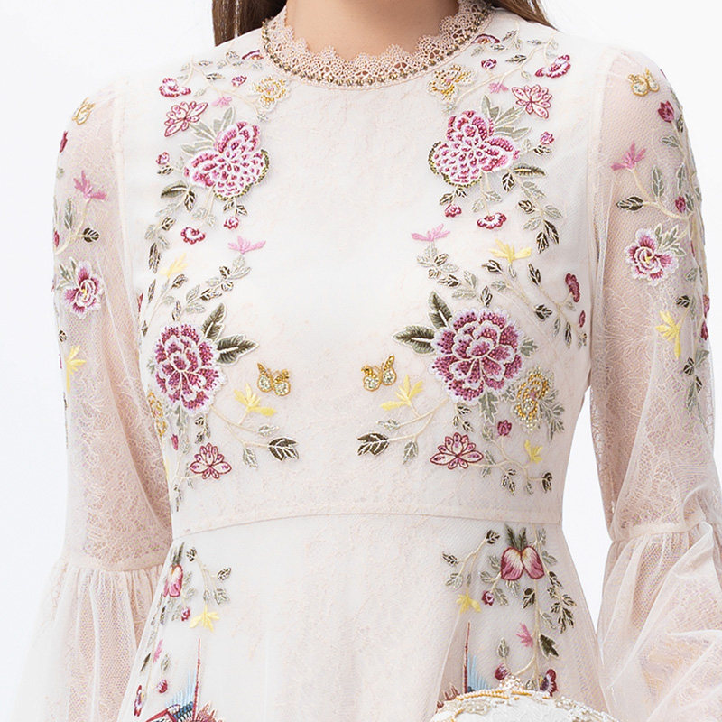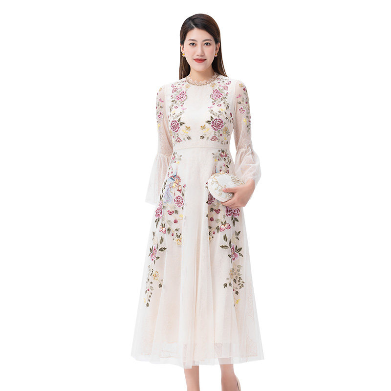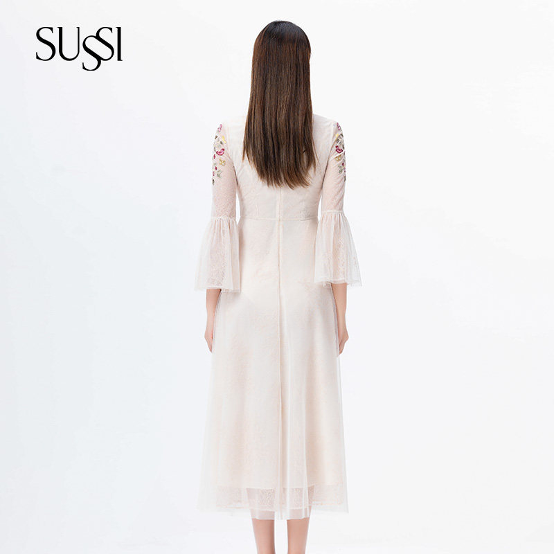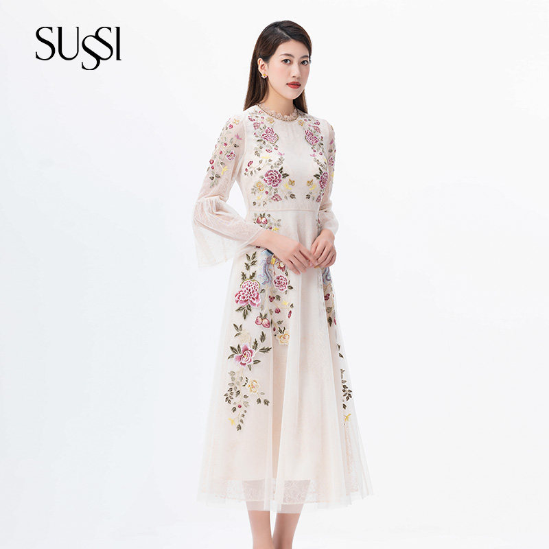 天猫SUSSI/古色秋商场同款杏色喇叭袖宫廷风圆领连衣裙女
