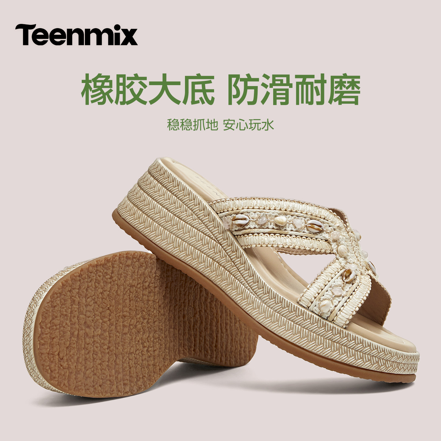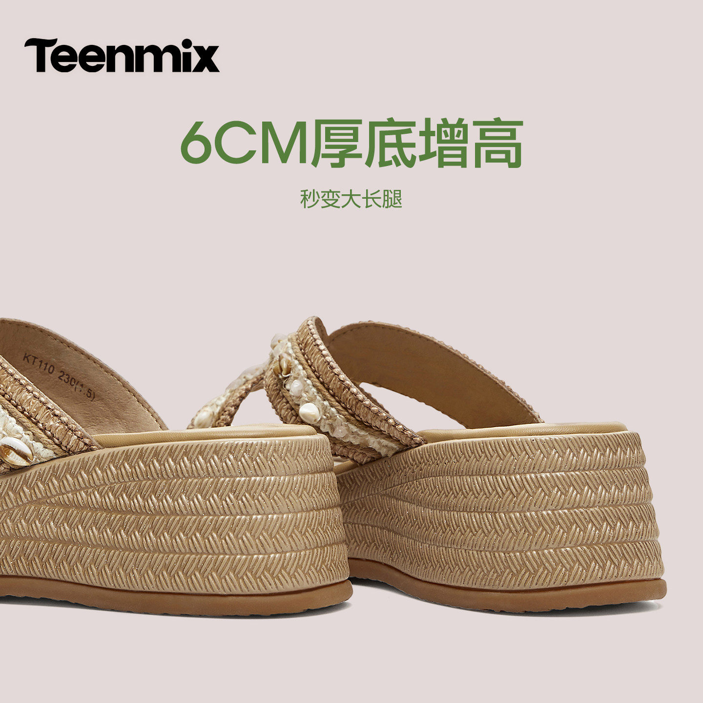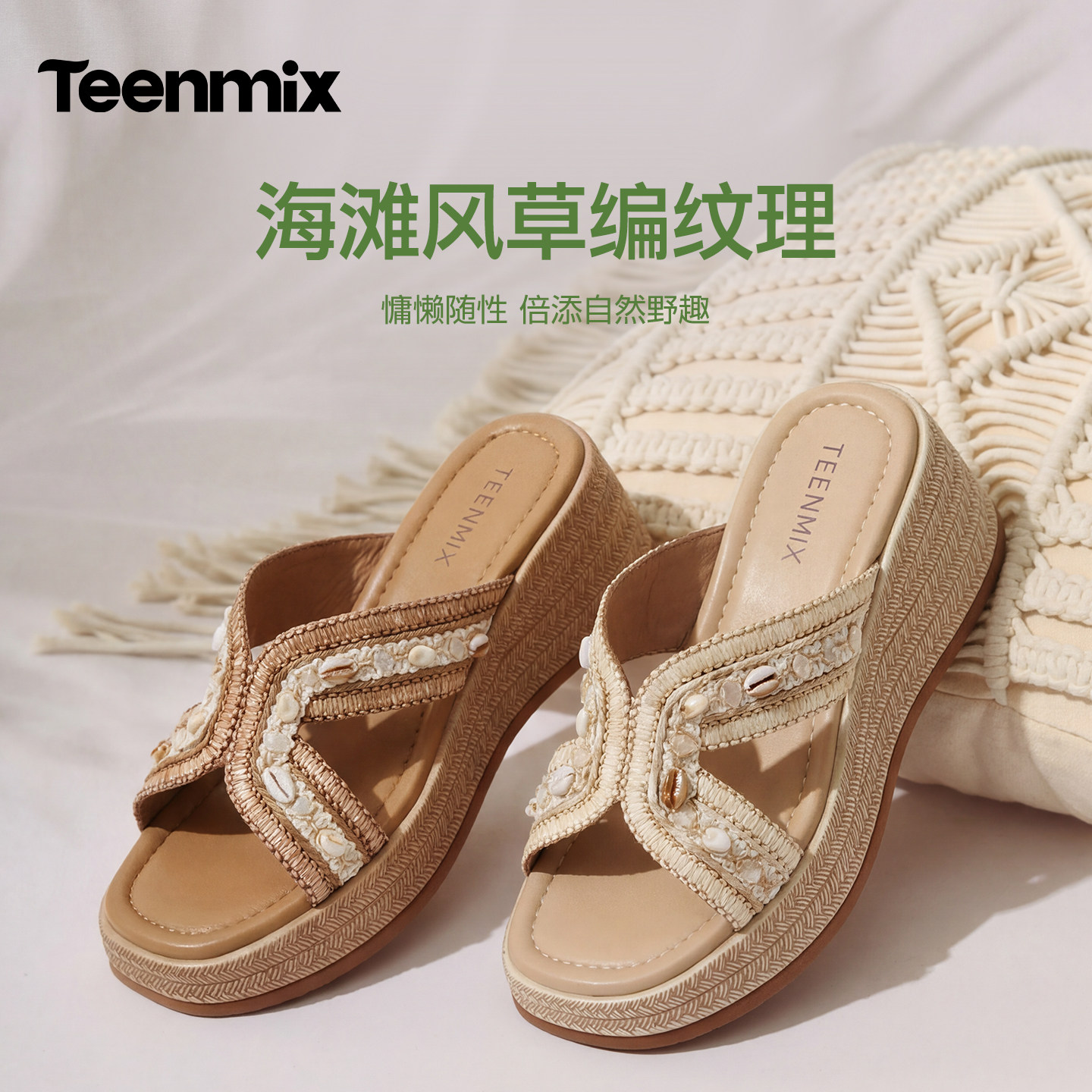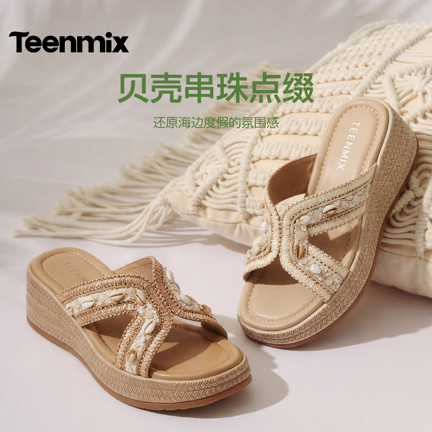 天猫天美意一字拖波西米亚坡跟厚底拖鞋女编织海边度假凉拖2026夏新款