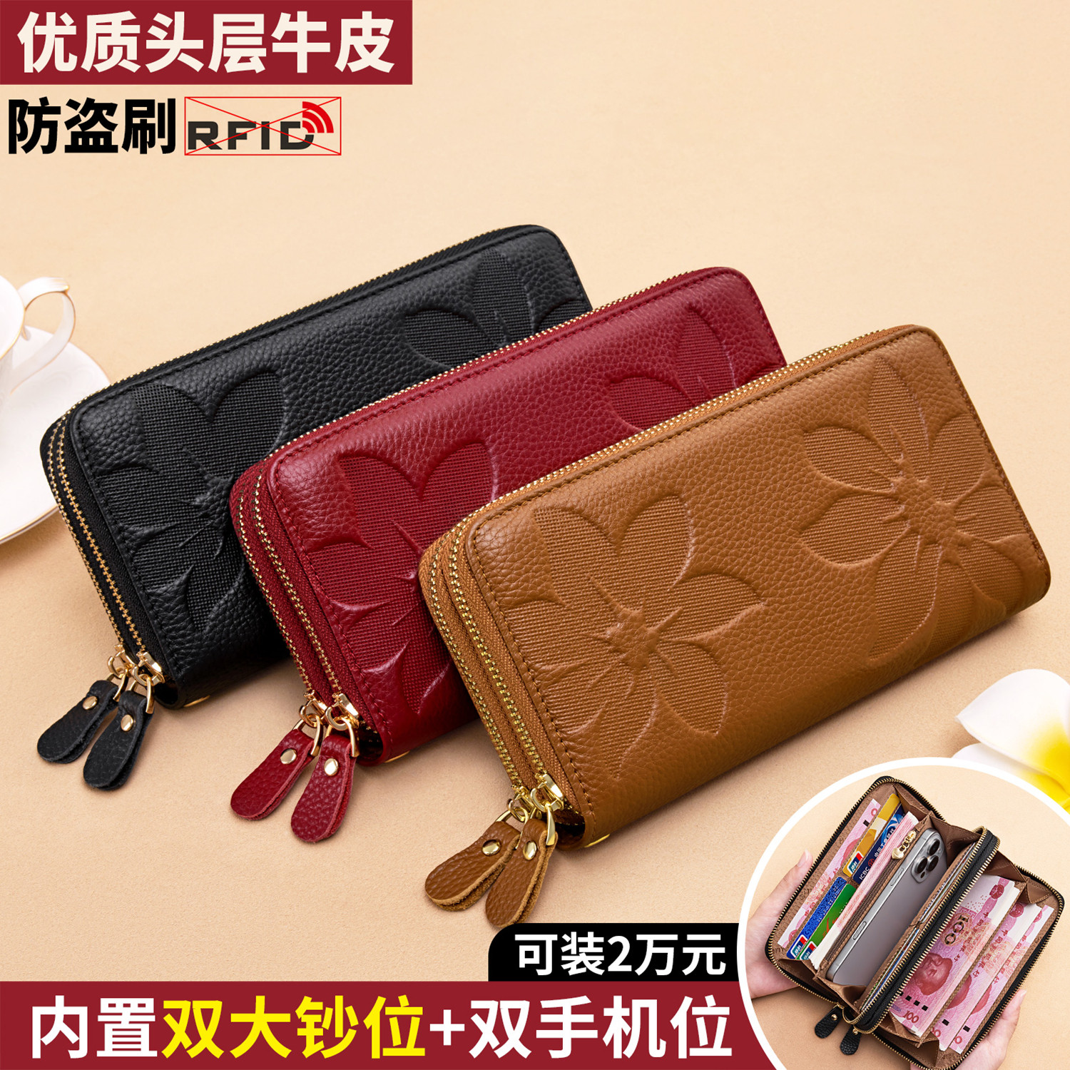 淘宝头层牛皮长钱包女大容量荔枝纹时尚潮流高档印花双拉链手拿包女