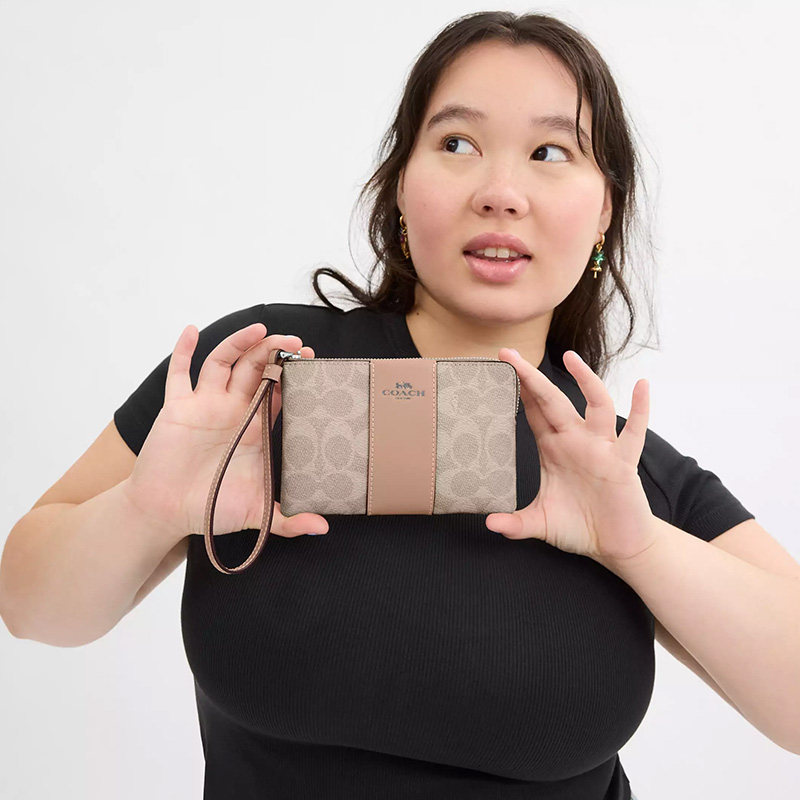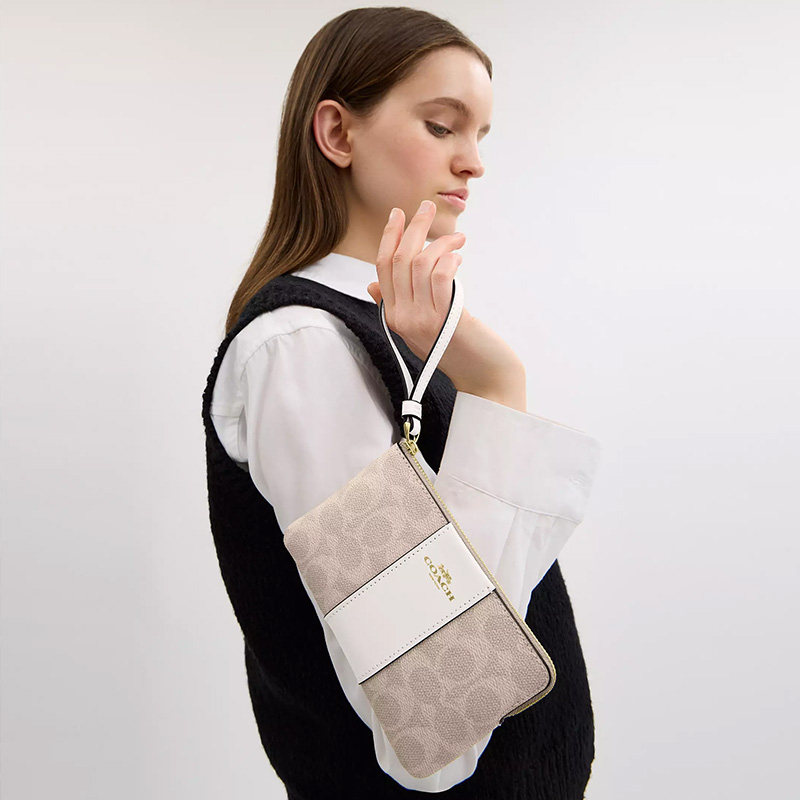 【国内正品】COACH/蔻驰女士新款拼色手腕包迷你零钱卡包,融合经典与现代设计,采用高品质皮革打造,质感细腻,耐用性强。包身以时尚拼色元素点缀,彰显个性品味,小巧轻便,可轻松容纳零钱、卡片及小件随身物品。配备可拆卸手腕带,手提或斜挎皆宜,日常出行、约会或通勤皆适用。内部结构合理,设有多个卡位与零钱袋,实用便捷。COACH品牌标识精致呈现,彰显轻奢格调。支持专柜验货,确保正品保障,是馈赠亲友或自用搭配的优选单品,演绎都市女性的优雅与从容。