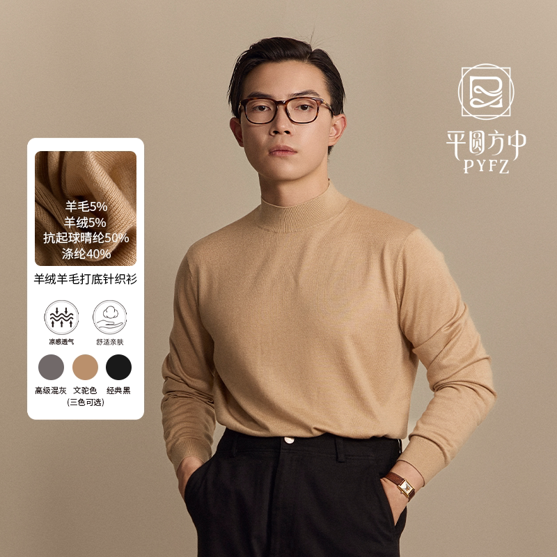 淘宝【羊绒羊毛打底薄款】平圆方中半高领毛衣套头衫纯色长袖针织衫男