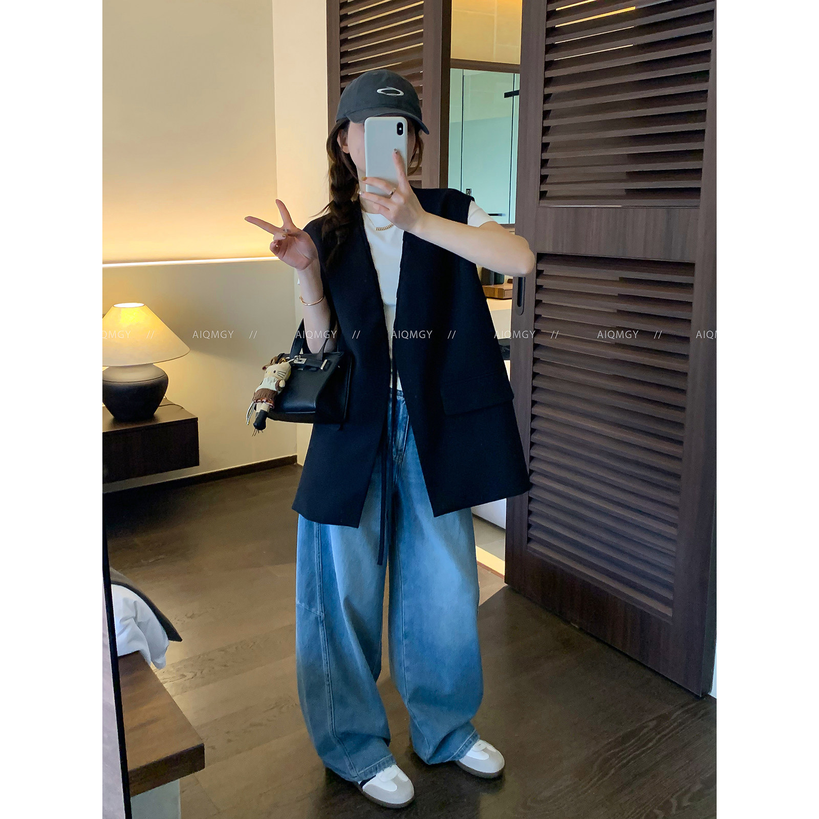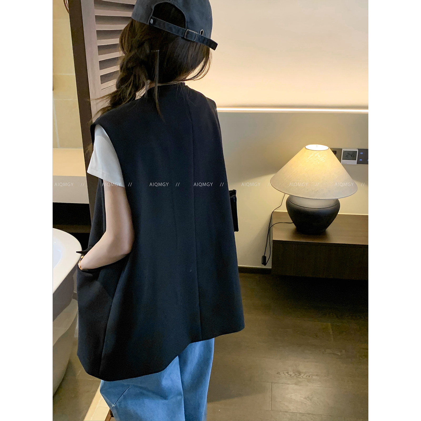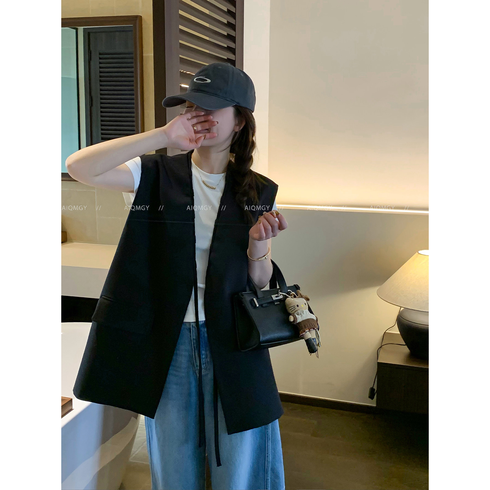 淘宝爱情魔鬼鱼 黑色V领中长款西装马甲女2026年春季新款外穿上衣外套