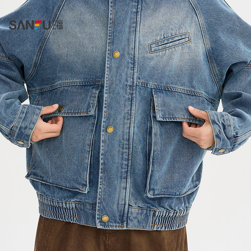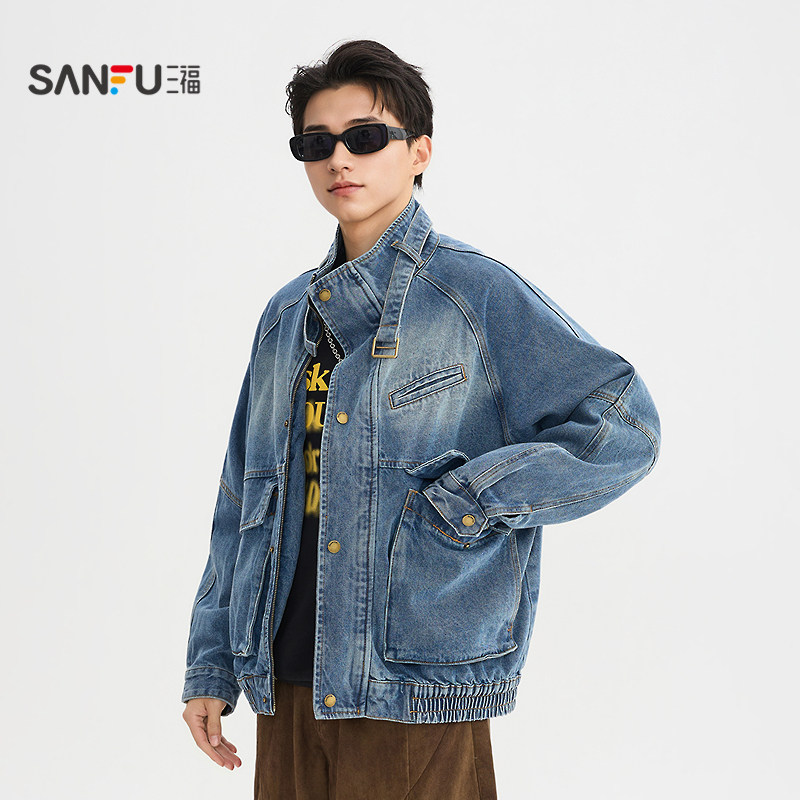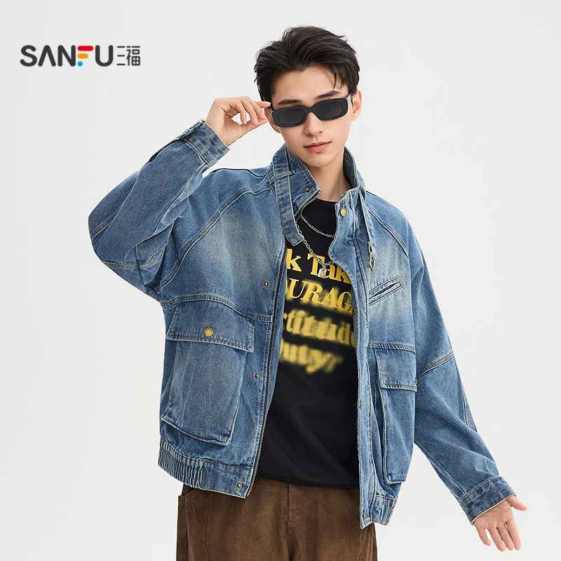 天猫三福2026春季新款男士分割结构喷马骝牛仔夹克宽松立领外套518571