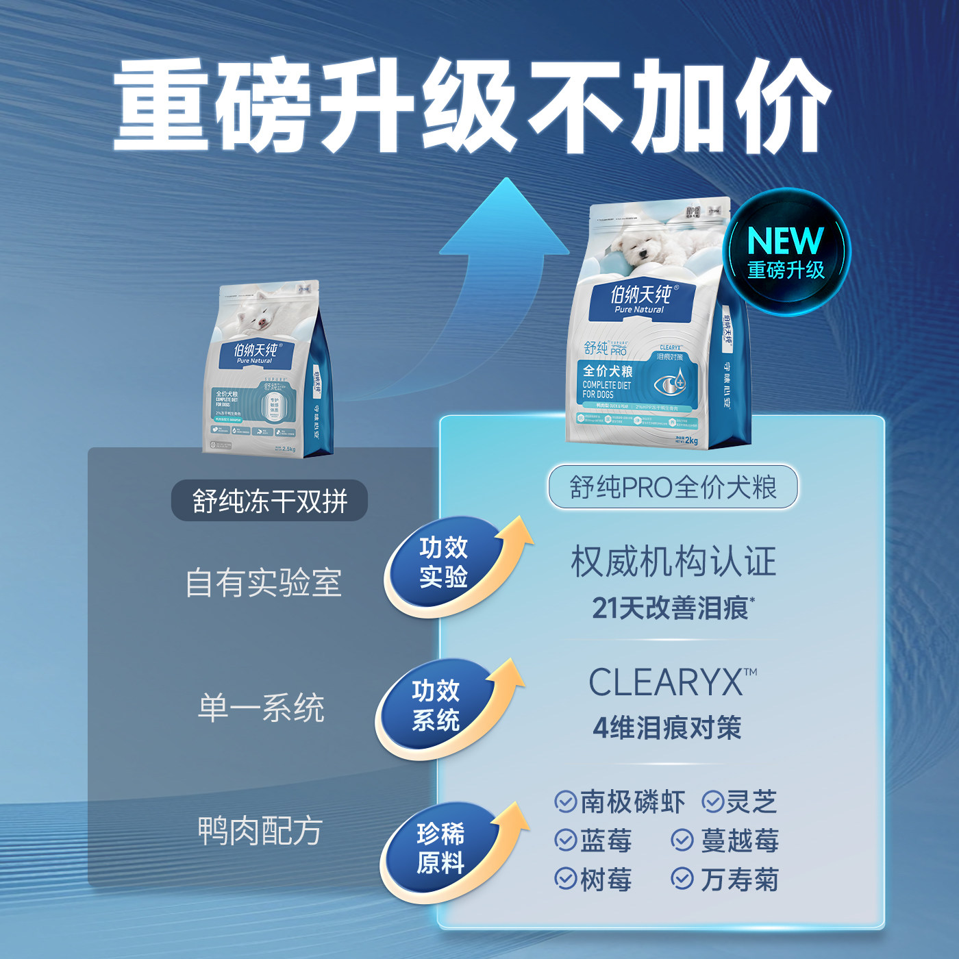 【舒纯PRO】伯纳天纯鸭肉梨冻干双拼狗粮,专为爱犬健康精心研制。精选优质鸭肉为主蛋白源,低敏易消化,搭配清火润肺的梨肉,呵护敏感肠胃。特别添加富含Omega-3的三文鱼与南极磷虾,助力皮肤健康、毛发亮泽。双拼冻干工艺锁住食材营养与鲜味,提升适口性,让挑食狗狗也爱吃。无谷物配方,减少过敏风险,营养均衡全面。大包装囤货装设计,经济实惠,适合多犬家庭或长期喂养。坚持天然无添加,不含诱食剂、防腐剂,守护爱犬每一口安全。舒纯PRO,用科学配比与天然食材,为爱犬提供高品质饮食体验,陪伴健康每一天。