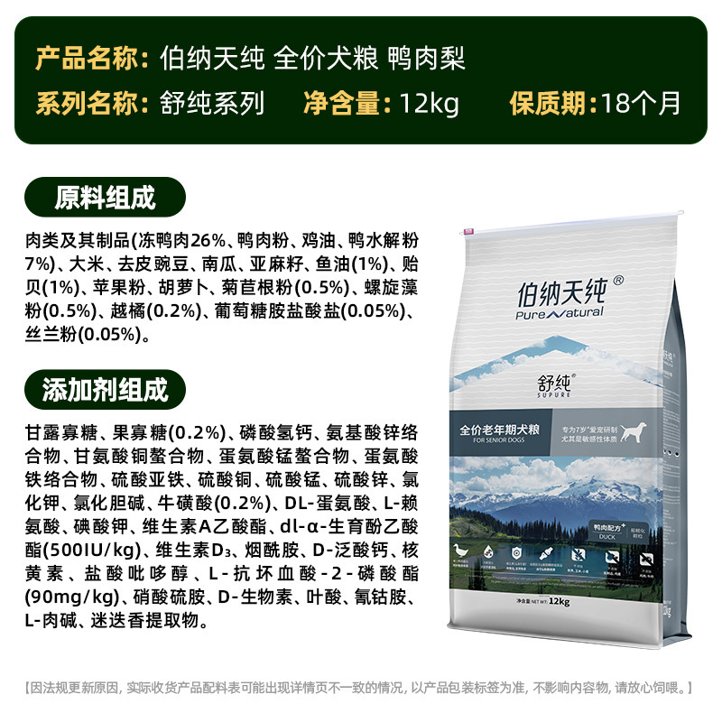 天猫臻选伯纳天纯狗粮舒纯系列老年犬鸭肉7岁以上高龄犬12kg营养