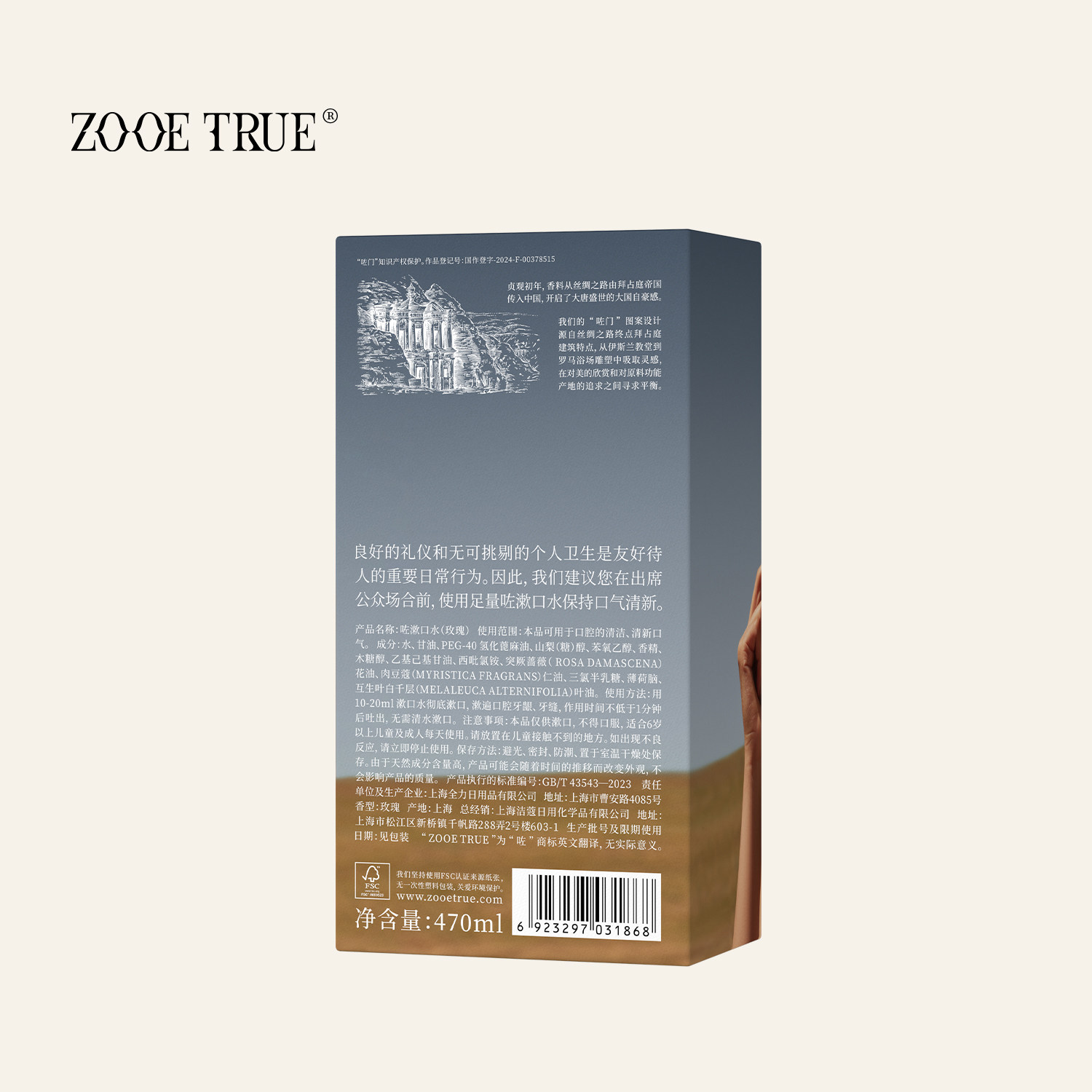 ZOOETRUE咗漱口水融合天然玫瑰精油、豆蔻与薄荷精华,无酒精配方温和不刺激,专为追求清新口气的现代人设计。玫瑰精油带来优雅芬芳,豆蔻舒缓口腔不适,薄荷则赋予持久清凉感,三效合一,深层清洁口腔残留,有效抑制异味,令呼吸如诗般清新怡人。其低敏配方适合敏感人群日常使用,不含酒精避免口干与刺激,呵护牙龈健康。ZOOETRUE以“口腔诗人”为理念,将天然植萃与科学配比结合,让每一次漱口都成为愉悦体验,随时随地绽放自信笑容,是注重生活品质与健康人群的理想之选。