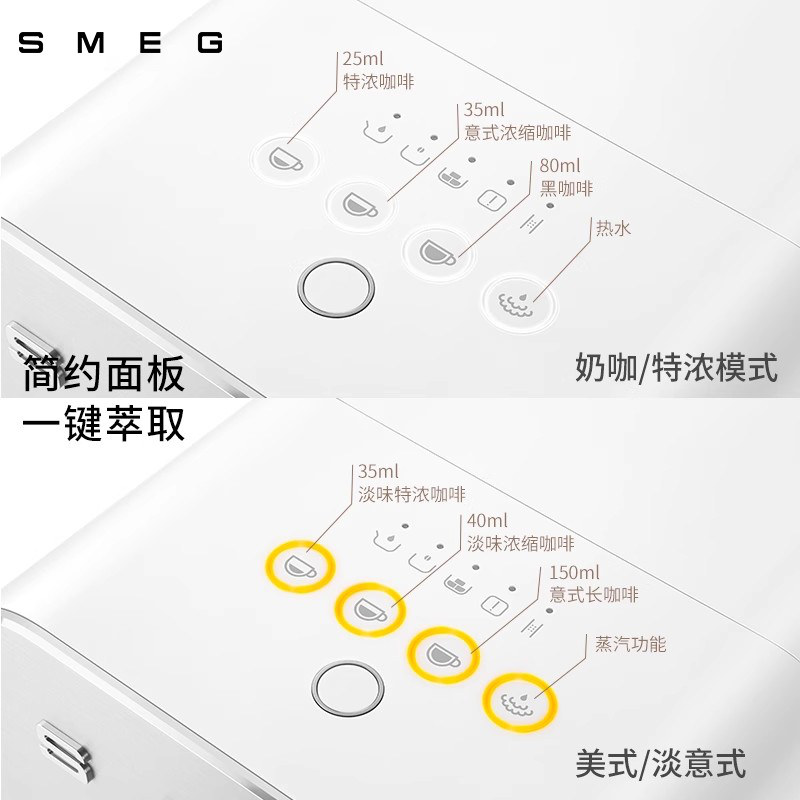 SMEG斯麦格BCC02全自动家用意式咖啡机集研磨、萃取、蒸汽拉花于一体,融合意式精湛工艺与经典复古设计。搭载15Bar专业泵压系统,可充分萃取咖啡精华,呈现浓郁醇厚的意式浓缩。内置锥形磨豆器,支持13档粗细调节,满足不同口味需求。配备强劲蒸汽系统,轻松打出细腻奶泡,助力在家实现专业级拉花体验。触控操作界面简洁直观,支持一键制作美式、浓缩等多种饮品。3.5英寸彩色显示屏实时显示状态,使用更便捷。不锈钢机身搭配复古造型,不仅性能出众,更成为厨房中的美学点缀,是追求品质生活的咖啡爱好者理想之选。