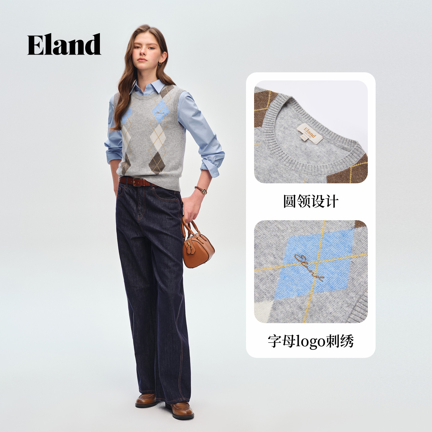 天猫【山羊绒+绵羊毛】Eland衣恋马夹女学院风菱格无袖针织2026春新款